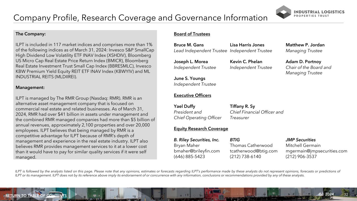 32Q1 2024RETURN TO TABLE OF CONTENTS Company Profile, Research Coverage and Governance Information The Company: ILPT is included in 117 market indices and comprises more than 1% of the following indices as of March 31, 2024: Invesco S&P SmallCap High Dividend Low Volatility ETF INAV Index (XSHDIV), Bloomberg US Micro Cap Real Estate Price Return Index (BMICR), Bloomberg Real Estate Investment Trust Small Cap Index (BBRESMLC), Invesco KBW Premium Yield Equity REIT ETF INAV Index (KBWYIV) and ML INDUSTRIAL REITS (MLDIIREI). Management: ILPT is managed by The RMR Group (Nasdaq: RMR). RMR is an alternative asset management company that is focused on commercial real estate and related businesses. As of March 31, 2024, RMR had over $41 billion in assets under management and the combined RMR managed companies had more than $5 billion of annual revenues, approximately 2,100 properties and over 20,000 employees. ILPT believes that being managed by RMR is a competitive advantage for ILPT because of RMR’s depth of management and experience in the real estate industry. ILPT also believes RMR provides management services to it at a lower cost than it would have to pay for similar quality services if it were self managed. Board of Trustees Bruce M. Gans Lisa Harris Jones Matthew P. Jordan Lead Independent Trustee Independent Trustee Managing Trustee Joseph L. Morea Kevin C. Phelan Adam D. Portnoy Independent Trustee Independent Trustee Chair of the Board and Managing Trustee June S. Youngs Independent Trustee Executive Officers Yael Duffy Tiffany R. Sy President and Chief Financial Officer and Chief Operating Officer Treasurer Equity Research Coverage B. Riley Securities, Inc. BTIG JMP Securities Bryan Maher Thomas Catherwood Mitchell Germain bmaher@brileyfin.com tcatherwood@btig.com mgermain@jmpsecurities.com (646) 885-5423 (212) 738-6140 (212) 906-3537 ILPT is followed by the analysts listed on this page. Please note that any opinions, estimates or forecasts regarding ILPT’s performance made by these analysts do not represent opinions, forecasts or predictions of ILPT or its management. ILPT does not by its reference above imply its endorsement of or concurrence with any information, conclusions or recommendations provided by any of these analysts.