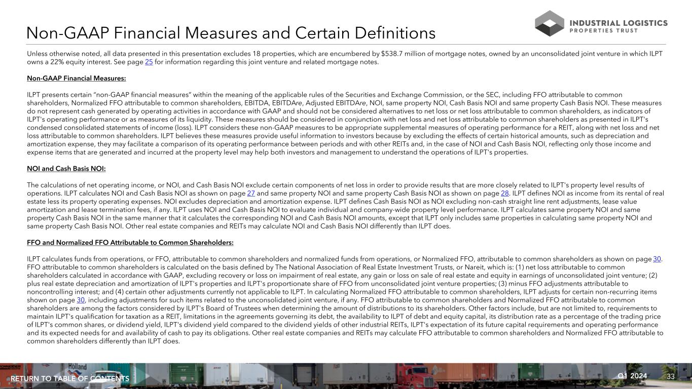 33Q1 2024RETURN TO TABLE OF CONTENTS Unless otherwise noted, all data presented in this presentation excludes 18 properties, which are encumbered by $538.7 million of mortgage notes, owned by an unconsolidated joint venture in which ILPT owns a 22% equity interest. See page 25 for information regarding this joint venture and related mortgage notes. Non-GAAP Financial Measures: ILPT presents certain “non-GAAP financial measures” within the meaning of the applicable rules of the Securities and Exchange Commission, or the SEC, including FFO attributable to common shareholders, Normalized FFO attributable to common shareholders, EBITDA, EBITDAre, Adjusted EBITDAre, NOI, same property NOI, Cash Basis NOI and same property Cash Basis NOI. These measures do not represent cash generated by operating activities in accordance with GAAP and should not be considered alternatives to net loss or net loss attributable to common shareholders, as indicators of ILPT's operating performance or as measures of its liquidity. These measures should be considered in conjunction with net loss and net loss attributable to common shareholders as presented in ILPT's condensed consolidated statements of income (loss). ILPT considers these non-GAAP measures to be appropriate supplemental measures of operating performance for a REIT, along with net loss and net loss attributable to common shareholders. ILPT believes these measures provide useful information to investors because by excluding the effects of certain historical amounts, such as depreciation and amortization expense, they may facilitate a comparison of its operating performance between periods and with other REITs and, in the case of NOI and Cash Basis NOI, reflecting only those income and expense items that are generated and incurred at the property level may help both investors and management to understand the operations of ILPT's properties. NOI and Cash Basis NOI: The calculations of net operating income, or NOI, and Cash Basis NOI exclude certain components of net loss in order to provide results that are more closely related to ILPT's property level results of operations. ILPT calculates NOI and Cash Basis NOI as shown on page 27 and same property NOI and same property Cash Basis NOI as shown on page 28. ILPT defines NOI as income from its rental of real estate less its property operating expenses. NOI excludes depreciation and amortization expense. ILPT defines Cash Basis NOI as NOI excluding non-cash straight line rent adjustments, lease value amortization and lease termination fees, if any. ILPT uses NOI and Cash Basis NOI to evaluate individual and company-wide property level performance. ILPT calculates same property NOI and same property Cash Basis NOI in the same manner that it calculates the corresponding NOI and Cash Basis NOI amounts, except that ILPT only includes same properties in calculating same property NOI and same property Cash Basis NOI. Other real estate companies and REITs may calculate NOI and Cash Basis NOI differently than ILPT does. FFO and Normalized FFO Attributable to Common Shareholders: ILPT calculates funds from operations, or FFO, attributable to common shareholders and normalized funds from operations, or Normalized FFO, attributable to common shareholders as shown on page 30. FFO attributable to common shareholders is calculated on the basis defined by The National Association of Real Estate Investment Trusts, or Nareit, which is: (1) net loss attributable to common shareholders calculated in accordance with GAAP, excluding recovery or loss on impairment of real estate, any gain or loss on sale of real estate and equity in earnings of unconsolidated joint venture; (2) plus real estate depreciation and amortization of ILPT's properties and ILPT's proportionate share of FFO from unconsolidated joint venture properties; (3) minus FFO adjustments attributable to noncontrolling interest; and (4) certain other adjustments currently not applicable to ILPT. In calculating Normalized FFO attributable to common shareholders, ILPT adjusts for certain non-recurring items shown on page 30, including adjustments for such items related to the unconsolidated joint venture, if any. FFO attributable to common shareholders and Normalized FFO attributable to common shareholders are among the factors considered by ILPT's Board of Trustees when determining the amount of distributions to its shareholders. Other factors include, but are not limited to, requirements to maintain ILPT's qualification for taxation as a REIT, limitations in the agreements governing its debt, the availability to ILPT of debt and equity capital, its distribution rate as a percentage of the trading price of ILPT's common shares, or dividend yield, ILPT's dividend yield compared to the dividend yields of other industrial REITs, ILPT's expectation of its future capital requirements and operating performance and its expected needs for and availability of cash to pay its obligations. Other real estate companies and REITs may calculate FFO attributable to common shareholders and Normalized FFO attributable to common shareholders differently than ILPT does. Non-GAAP Financial Measures and Certain Definitions