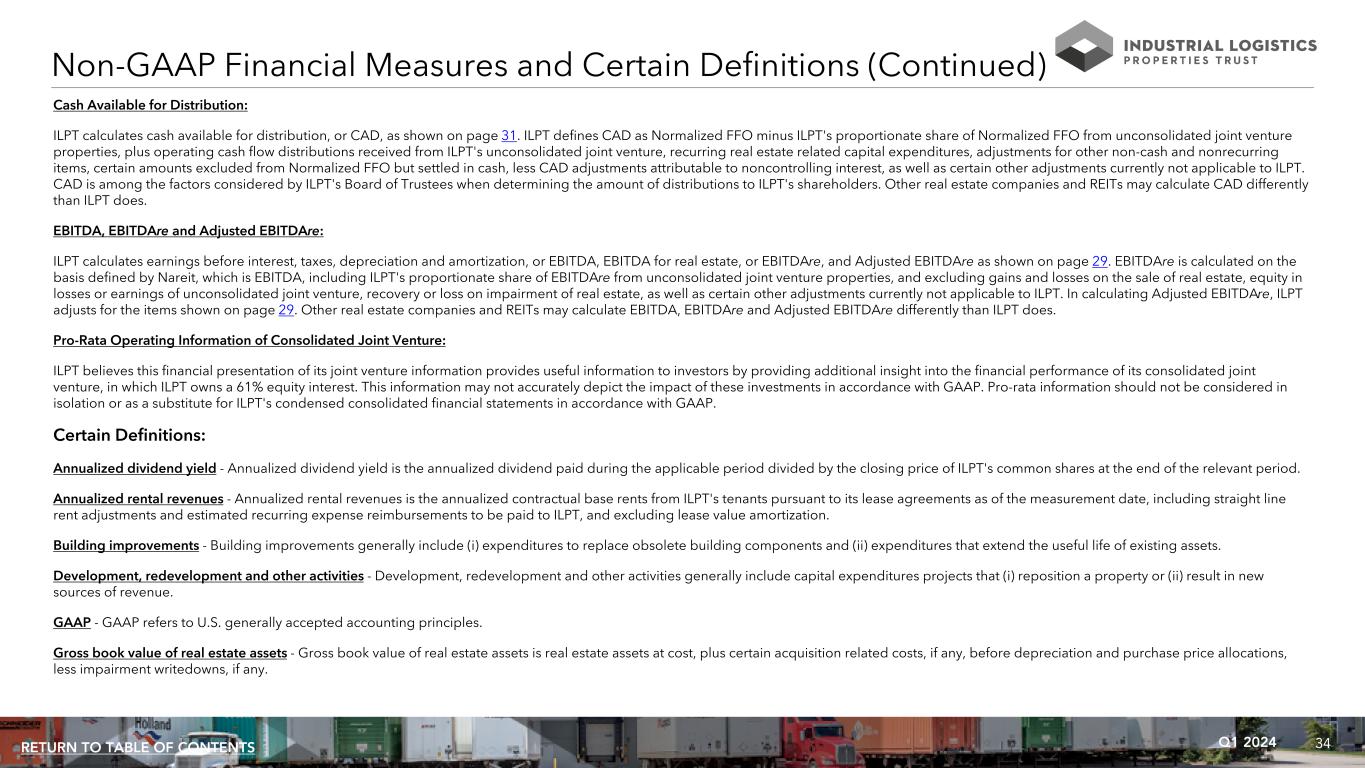 34Q1 2024RETURN TO TABLE OF CONTENTS Non-GAAP Financial Measures and Certain Definitions (Continued) Cash Available for Distribution: ILPT calculates cash available for distribution, or CAD, as shown on page 31. ILPT defines CAD as Normalized FFO minus ILPT's proportionate share of Normalized FFO from unconsolidated joint venture properties, plus operating cash flow distributions received from ILPT's unconsolidated joint venture, recurring real estate related capital expenditures, adjustments for other non-cash and nonrecurring items, certain amounts excluded from Normalized FFO but settled in cash, less CAD adjustments attributable to noncontrolling interest, as well as certain other adjustments currently not applicable to ILPT. CAD is among the factors considered by ILPT's Board of Trustees when determining the amount of distributions to ILPT's shareholders. Other real estate companies and REITs may calculate CAD differently than ILPT does. EBITDA, EBITDAre and Adjusted EBITDAre: ILPT calculates earnings before interest, taxes, depreciation and amortization, or EBITDA, EBITDA for real estate, or EBITDAre, and Adjusted EBITDAre as shown on page 29. EBITDAre is calculated on the basis defined by Nareit, which is EBITDA, including ILPT's proportionate share of EBITDAre from unconsolidated joint venture properties, and excluding gains and losses on the sale of real estate, equity in losses or earnings of unconsolidated joint venture, recovery or loss on impairment of real estate, as well as certain other adjustments currently not applicable to ILPT. In calculating Adjusted EBITDAre, ILPT adjusts for the items shown on page 29. Other real estate companies and REITs may calculate EBITDA, EBITDAre and Adjusted EBITDAre differently than ILPT does. Pro-Rata Operating Information of Consolidated Joint Venture: ILPT believes this financial presentation of its joint venture information provides useful information to investors by providing additional insight into the financial performance of its consolidated joint venture, in which ILPT owns a 61% equity interest. This information may not accurately depict the impact of these investments in accordance with GAAP. Pro-rata information should not be considered in isolation or as a substitute for ILPT's condensed consolidated financial statements in accordance with GAAP. Certain Definitions: Annualized dividend yield - Annualized dividend yield is the annualized dividend paid during the applicable period divided by the closing price of ILPT's common shares at the end of the relevant period. Annualized rental revenues - Annualized rental revenues is the annualized contractual base rents from ILPT's tenants pursuant to its lease agreements as of the measurement date, including straight line rent adjustments and estimated recurring expense reimbursements to be paid to ILPT, and excluding lease value amortization. Building improvements - Building improvements generally include (i) expenditures to replace obsolete building components and (ii) expenditures that extend the useful life of existing assets. Development, redevelopment and other activities - Development, redevelopment and other activities generally include capital expenditures projects that (i) reposition a property or (ii) result in new sources of revenue. GAAP - GAAP refers to U.S. generally accepted accounting principles. Gross book value of real estate assets - Gross book value of real estate assets is real estate assets at cost, plus certain acquisition related costs, if any, before depreciation and purchase price allocations, less impairment writedowns, if any.