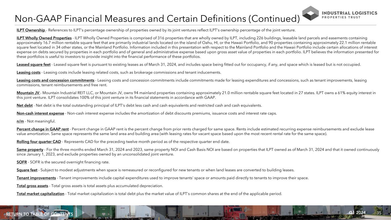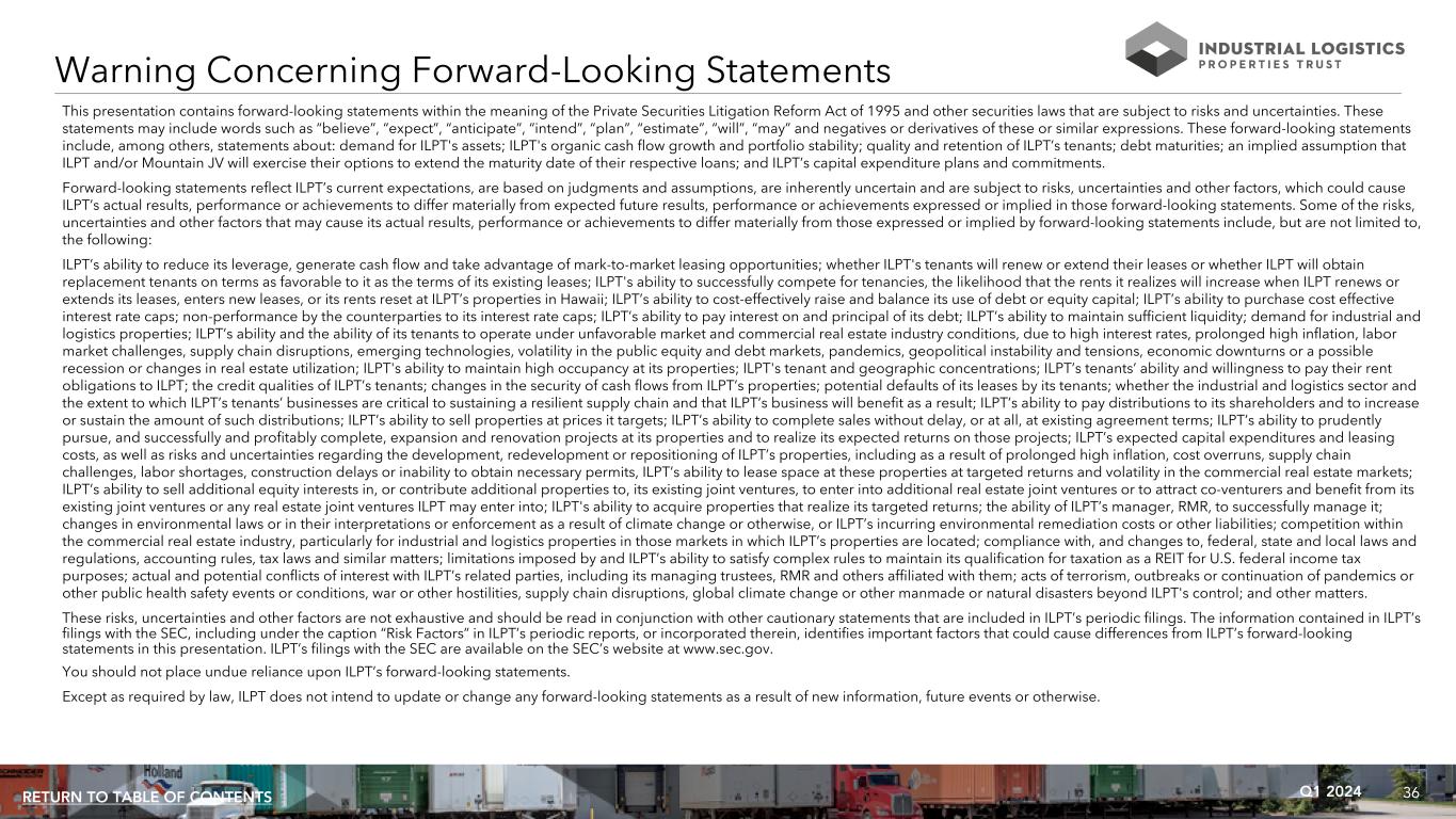 35Q1 2024RETURN TO TABLE OF CONTENTS ILPT Ownership - References to ILPT's percentage ownership of properties owned by its joint ventures reflect ILPT's ownership percentage of the joint venture. ILPT Wholly Owned Properties - ILPT Wholly Owned Properties is comprised of 316 properties that are wholly owned by ILPT, including 226 buildings, leasable land parcels and easements containing approximately 16.7 million rentable square feet that are primarily industrial lands located on the island of Oahu, HI, or the Hawaii Portfolio, and 90 properties containing approximately 22.1 million rentable square feet located in 34 other states, or the Mainland Portfolio. Information included in this presentation with respect to the Mainland Portfolio and the Hawaii Portfolio include certain allocations of interest expense on debts secured by properties in each portfolio and of general and administrative expense based upon gross asset value of properties in each portfolio. ILPT believes the information presented for these portfolios is useful to investors to provide insight into the financial performance of these portfolios. Leased square feet - Leased square feet is pursuant to existing leases as of March 31, 2024, and includes space being fitted out for occupancy, if any, and space which is leased but is not occupied. Leasing costs - Leasing costs include leasing related costs, such as brokerage commissions and tenant inducements. Leasing costs and concession commitments - Leasing costs and concession commitments include commitments made for leasing expenditures and concessions, such as tenant improvements, leasing commissions, tenant reimbursements and free rent. Mountain JV - Mountain Industrial REIT LLC, or Mountain JV, owns 94 mainland properties containing approximately 21.0 million rentable square feet located in 27 states. ILPT owns a 61% equity interest in this joint venture. ILPT consolidates 100% of this joint venture in its financial statements in accordance with GAAP. Net debt - Net debt is the total outstanding principal of ILPT's debt less cash and cash equivalents and restricted cash and cash equivalents. Non-cash interest expense - Non-cash interest expense includes the amortization of debt discounts premiums, issuance costs and interest rate caps. n/m - Not meaningful. Percent change in GAAP rent - Percent change in GAAP rent is the percent change from prior rents charged for same space. Rents include estimated recurring expense reimbursements and exclude lease value amortization. Same space represents the same land area and building area (with leasing rates for vacant space based upon the most recent rental rate for the same space). Rolling four quarter CAD - Represents CAD for the preceding twelve month period as of the respective quarter end date. Same property - For the three months ended March 31, 2024 and 2023, same property NOI and Cash Basis NOI are based on properties that ILPT owned as of March 31, 2024 and that it owned continuously since January 1, 2023, and exclude properties owned by an unconsolidated joint venture. SOFR - SOFR is the secured overnight financing rate. Square feet - Subject to modest adjustments when space is remeasured or reconfigured for new tenants or when land leases are converted to building leases. Tenant improvements - Tenant improvements include capital expenditures used to improve tenants' space or amounts paid directly to tenants to improve their space. Total gross assets - Total gross assets is total assets plus accumulated depreciation. Total market capitalization - Total market capitalization is total debt plus the market value of ILPT's common shares at the end of the applicable period. Non-GAAP Financial Measures and Certain Definitions (Continued)
