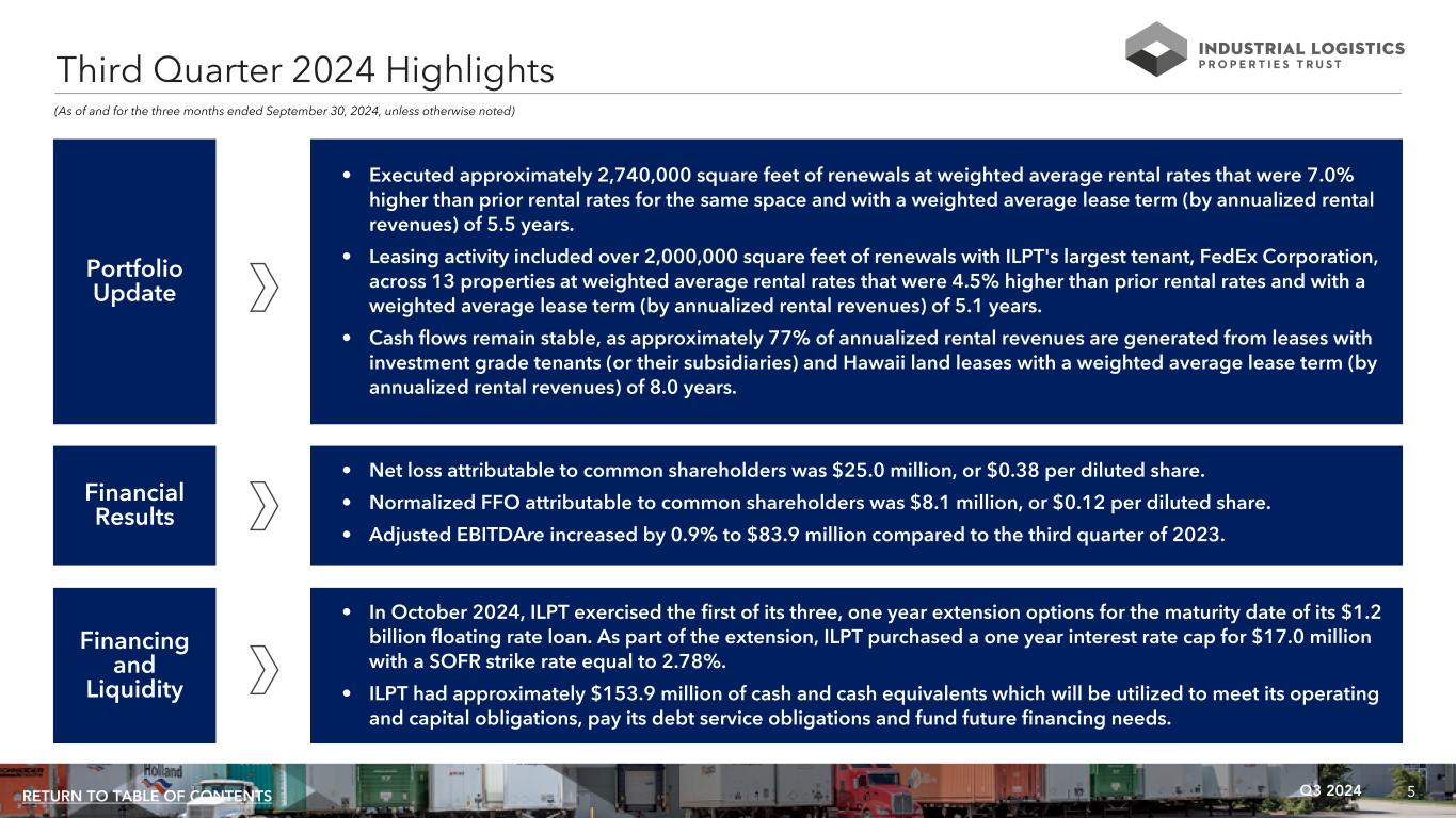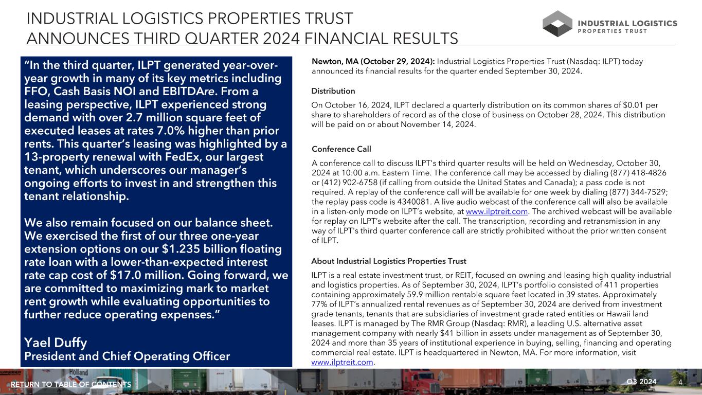 4Q3 2024RETURN TO TABLE OF CONTENTS “In the third quarter, ILPT generated year-over- year growth in many of its key metrics including FFO, Cash Basis NOI and EBITDAre. From a leasing perspective, ILPT experienced strong demand with over 2.7 million square feet of executed leases at rates 7.0% higher than prior rents. This quarter’s leasing was highlighted by a 13-property renewal with FedEx, our largest tenant, which underscores our manager’s ongoing efforts to invest in and strengthen this tenant relationship. We also remain focused on our balance sheet. We exercised the first of our three one-year extension options on our $1.235 billion floating rate loan with a lower-than-expected interest rate cap cost of $17.0 million. Going forward, we are committed to maximizing mark to market rent growth while evaluating opportunities to further reduce operating expenses.” Yael Duffy President and Chief Operating Officer INDUSTRIAL LOGISTICS PROPERTIES TRUST ANNOUNCES THIRD QUARTER 2024 FINANCIAL RESULTS Newton, MA (October 29, 2024): Industrial Logistics Properties Trust (Nasdaq: ILPT) today announced its financial results for the quarter ended September 30, 2024. Distribution On October 16, 2024, ILPT declared a quarterly distribution on its common shares of $0.01 per share to shareholders of record as of the close of business on October 28, 2024. This distribution will be paid on or about November 14, 2024. Conference Call A conference call to discuss ILPT's third quarter results will be held on Wednesday, October 30, 2024 at 10:00 a.m. Eastern Time. The conference call may be accessed by dialing (877) 418-4826 or (412) 902-6758 (if calling from outside the United States and Canada); a pass code is not required. A replay of the conference call will be available for one week by dialing (877) 344-7529; the replay pass code is 4340081. A live audio webcast of the conference call will also be available in a listen-only mode on ILPT’s website, at www.ilptreit.com. The archived webcast will be available for replay on ILPT’s website after the call. The transcription, recording and retransmission in any way of ILPT's third quarter conference call are strictly prohibited without the prior written consent of ILPT. About Industrial Logistics Properties Trust ILPT is a real estate investment trust, or REIT, focused on owning and leasing high quality industrial and logistics properties. As of September 30, 2024, ILPT’s portfolio consisted of 411 properties containing approximately 59.9 million rentable square feet located in 39 states. Approximately 77% of ILPT’s annualized rental revenues as of September 30, 2024 are derived from investment grade tenants, tenants that are subsidiaries of investment grade rated entities or Hawaii land leases. ILPT is managed by The RMR Group (Nasdaq: RMR), a leading U.S. alternative asset management company with nearly $41 billion in assets under management as of September 30, 2024 and more than 35 years of institutional experience in buying, selling, financing and operating commercial real estate. ILPT is headquartered in Newton, MA. For more information, visit www.ilptreit.com.