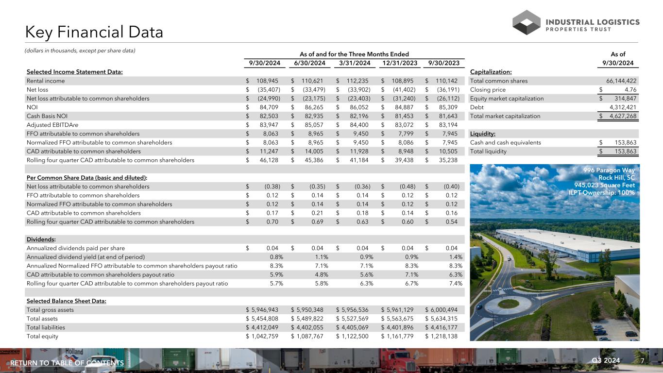 7Q3 2024RETURN TO TABLE OF CONTENTS As of and for the Three Months Ended As of 9/30/2024 6/30/2024 3/31/2024 12/31/2023 9/30/2023 9/30/2024 Selected Income Statement Data: Capitalization: Rental income $ 108,945 $ 110,621 $ 112,235 $ 108,895 $ 110,142 Total common shares 66,144,422 Net loss $ (35,407) $ (33,479) $ (33,902) $ (41,402) $ (36,191) Closing price $ 4.76 Net loss attributable to common shareholders $ (24,990) $ (23,175) $ (23,403) $ (31,240) $ (26,112) Equity market capitalization $ 314,847 NOI $ 84,709 $ 86,265 $ 86,052 $ 84,887 $ 85,309 Debt 4,312,421 Cash Basis NOI $ 82,503 $ 82,935 $ 82,196 $ 81,453 $ 81,643 Total market capitalization $ 4,627,268 Adjusted EBITDAre $ 83,947 $ 85,057 $ 84,400 $ 83,072 $ 83,194 FFO attributable to common shareholders $ 8,063 $ 8,965 $ 9,450 $ 7,799 $ 7,945 Liquidity: Normalized FFO attributable to common shareholders $ 8,063 $ 8,965 $ 9,450 $ 8,086 $ 7,945 Cash and cash equivalents $ 153,863 CAD attributable to common shareholders $ 11,247 $ 14,005 $ 11,928 $ 8,948 $ 10,505 Total liquidity $ 153,863 Rolling four quarter CAD attributable to common shareholders $ 46,128 $ 45,386 $ 41,184 $ 39,438 $ 35,238 Per Common Share Data (basic and diluted): Net loss attributable to common shareholders $ (0.38) $ (0.35) $ (0.36) $ (0.48) $ (0.40) FFO attributable to common shareholders $ 0.12 $ 0.14 $ 0.14 $ 0.12 $ 0.12 Normalized FFO attributable to common shareholders $ 0.12 $ 0.14 $ 0.14 $ 0.12 $ 0.12 CAD attributable to common shareholders $ 0.17 $ 0.21 $ 0.18 $ 0.14 $ 0.16 Rolling four quarter CAD attributable to common shareholders $ 0.70 $ 0.69 $ 0.63 $ 0.60 $ 0.54 Dividends: Annualized dividends paid per share $ 0.04 $ 0.04 $ 0.04 $ 0.04 $ 0.04 Annualized dividend yield (at end of period) 0.8% 1.1% 0.9% 0.9% 1.4% Annualized Normalized FFO attributable to common shareholders payout ratio 8.3% 7.1% 7.1% 8.3% 8.3% CAD attributable to common shareholders payout ratio 5.9% 4.8% 5.6% 7.1% 6.3% Rolling four quarter CAD attributable to common shareholders payout ratio 5.7% 5.8% 6.3% 6.7% 7.4% Selected Balance Sheet Data: Total gross assets $ 5,946,943 $ 5,950,348 $ 5,956,536 $ 5,961,129 $ 6,000,494 Total assets $ 5,454,808 $ 5,489,822 $ 5,527,569 $ 5,563,675 $ 5,634,315 Total liabilities $ 4,412,049 $ 4,402,055 $ 4,405,069 $ 4,401,896 $ 4,416,177 Total equity $ 1,042,759 $ 1,087,767 $ 1,122,500 $ 1,161,779 $ 1,218,138 (dollars in thousands, except per share data) Key Financial Data 996 Paragon Way Rock Hill, SC 945,023 Square Feet ILPT Ownership: 100%