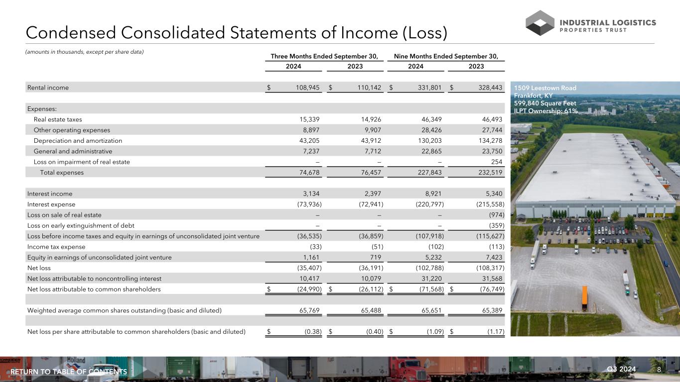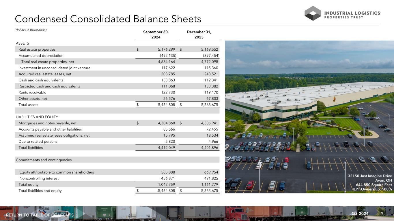 8Q3 2024RETURN TO TABLE OF CONTENTS Condensed Consolidated Statements of Income (Loss) Three Months Ended September 30, Nine Months Ended September 30, 2024 2023 2024 2023 Rental income $ 108,945 $ 110,142 $ 331,801 $ 328,443 Expenses: Real estate taxes 15,339 14,926 46,349 46,493 Other operating expenses 8,897 9,907 28,426 27,744 Depreciation and amortization 43,205 43,912 130,203 134,278 General and administrative 7,237 7,712 22,865 23,750 Loss on impairment of real estate — — — 254 Total expenses 74,678 76,457 227,843 232,519 Interest income 3,134 2,397 8,921 5,340 Interest expense (73,936) (72,941) (220,797) (215,558) Loss on sale of real estate — — — (974) Loss on early extinguishment of debt — — — (359) Loss before income taxes and equity in earnings of unconsolidated joint venture (36,535) (36,859) (107,918) (115,627) Income tax expense (33) (51) (102) (113) Equity in earnings of unconsolidated joint venture 1,161 719 5,232 7,423 Net loss (35,407) (36,191) (102,788) (108,317) Net loss attributable to noncontrolling interest 10,417 10,079 31,220 31,568 Net loss attributable to common shareholders $ (24,990) $ (26,112) $ (71,568) $ (76,749) Weighted average common shares outstanding (basic and diluted) 65,769 65,488 65,651 65,389 Net loss per share attributable to common shareholders (basic and diluted) $ (0.38) $ (0.40) $ (1.09) $ (1.17) (amounts in thousands, except per share data) 1509 Leestown Road Frankfort, KY 599,840 Square Feet ILPT Ownership: 61%