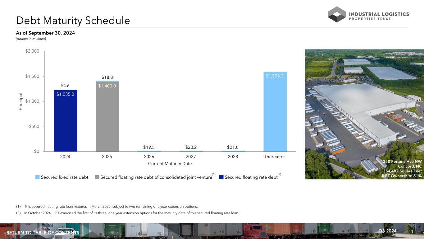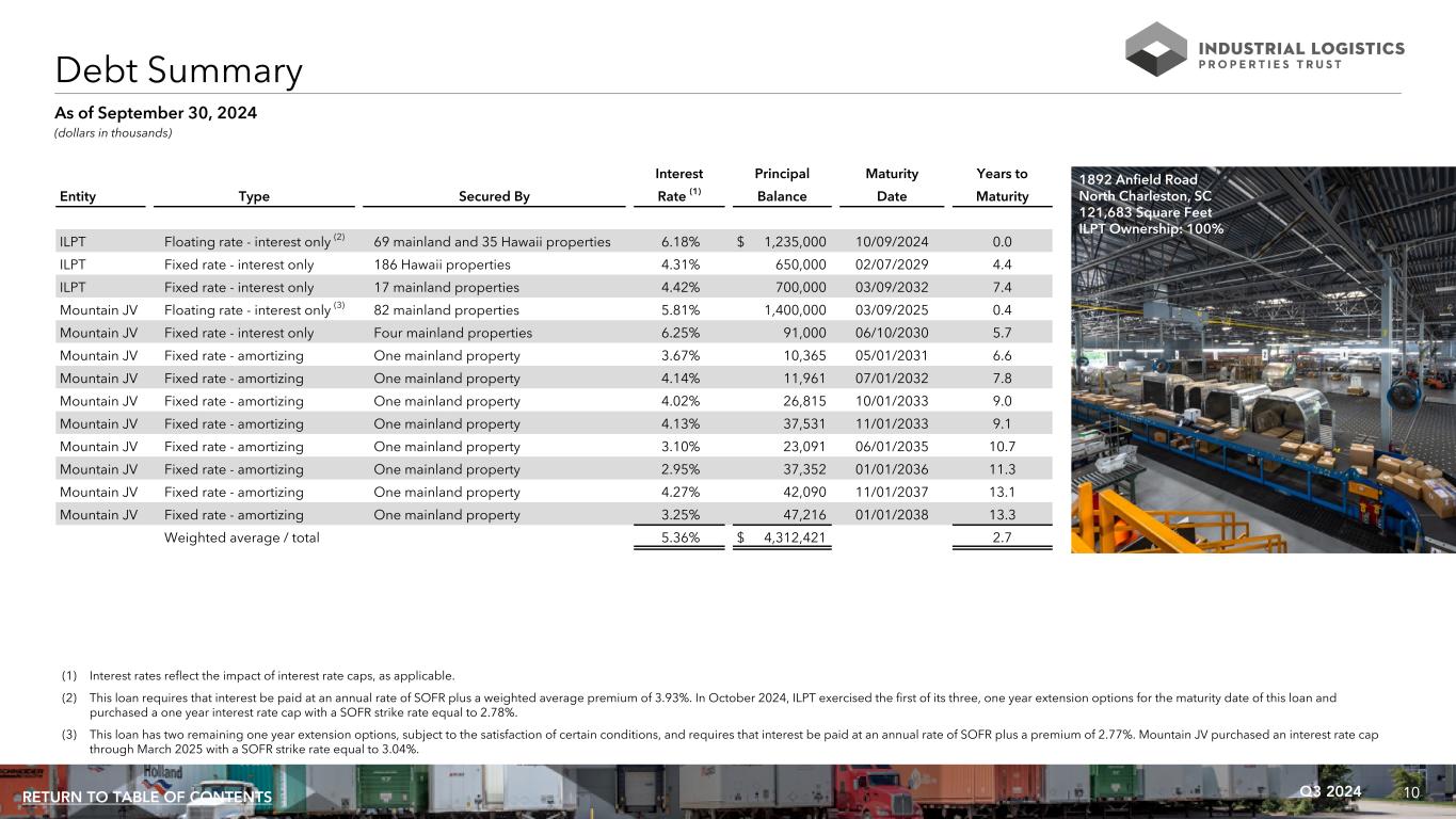 10Q3 2024RETURN TO TABLE OF CONTENTS (1) Interest rates reflect the impact of interest rate caps, as applicable. (2) This loan requires that interest be paid at an annual rate of SOFR plus a weighted average premium of 3.93%. In October 2024, ILPT exercised the first of its three, one year extension options for the maturity date of this loan and purchased a one year interest rate cap with a SOFR strike rate equal to 2.78%. (3) This loan has two remaining one year extension options, subject to the satisfaction of certain conditions, and requires that interest be paid at an annual rate of SOFR plus a premium of 2.77%. Mountain JV purchased an interest rate cap through March 2025 with a SOFR strike rate equal to 3.04%. Interest Principal Maturity Years to Entity Type Secured By Rate (1) Balance Date Maturity ILPT Floating rate - interest only (2) 69 mainland and 35 Hawaii properties 6.18% $ 1,235,000 10/09/2024 0.0 ILPT Fixed rate - interest only 186 Hawaii properties 4.31% 650,000 02/07/2029 4.4 ILPT Fixed rate - interest only 17 mainland properties 4.42% 700,000 03/09/2032 7.4 Mountain JV Floating rate - interest only (3) 82 mainland properties 5.81% 1,400,000 03/09/2025 0.4 Mountain JV Fixed rate - interest only Four mainland properties 6.25% 91,000 06/10/2030 5.7 Mountain JV Fixed rate - amortizing One mainland property 3.67% 10,365 05/01/2031 6.6 Mountain JV Fixed rate - amortizing One mainland property 4.14% 11,961 07/01/2032 7.8 Mountain JV Fixed rate - amortizing One mainland property 4.02% 26,815 10/01/2033 9.0 Mountain JV Fixed rate - amortizing One mainland property 4.13% 37,531 11/01/2033 9.1 Mountain JV Fixed rate - amortizing One mainland property 3.10% 23,091 06/01/2035 10.7 Mountain JV Fixed rate - amortizing One mainland property 2.95% 37,352 01/01/2036 11.3 Mountain JV Fixed rate - amortizing One mainland property 4.27% 42,090 11/01/2037 13.1 Mountain JV Fixed rate - amortizing One mainland property 3.25% 47,216 01/01/2038 13.3 Weighted average / total 5.36% $ 4,312,421 2.7 Debt Summary (dollars in thousands) As of September 30, 2024 1892 Anfield Road North Charleston, SC 121,683 Square Feet ILPT Ownership: 100%