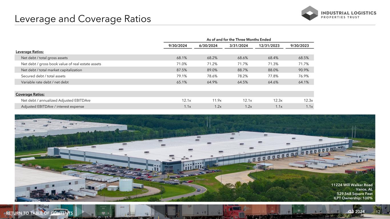 12Q3 2024RETURN TO TABLE OF CONTENTS As of and for the Three Months Ended 9/30/2024 6/30/2024 3/31/2024 12/31/2023 9/30/2023 Leverage Ratios: Net debt / total gross assets 68.1% 68.2% 68.6% 68.4% 68.5% Net debt / gross book value of real estate assets 71.0% 71.2% 71.7% 71.3% 71.7% Net debt / total market capitalization 87.5% 89.0% 88.7% 88.0% 90.9% Secured debt / total assets 79.1% 78.6% 78.2% 77.8% 76.9% Variable rate debt / net debt 65.1% 64.9% 64.5% 64.6% 64.1% Coverage Ratios: Net debt / annualized Adjusted EBITDAre 12.1x 11.9x 12.1x 12.3x 12.3x Adjusted EBITDAre / interest expense 1.1x 1.2x 1.2x 1.1x 1.1x Leverage and Coverage Ratios 11224 Will Walker Road Vance, AL 529,568 Square Feet ILPT Ownership: 100%