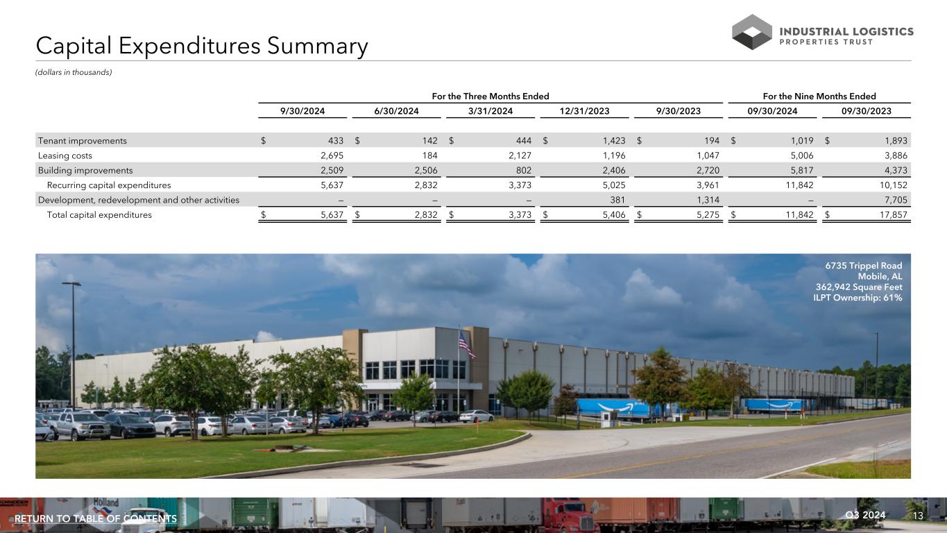 13Q3 2024RETURN TO TABLE OF CONTENTS (dollars in thousands) For the Three Months Ended For the Nine Months Ended 9/30/2024 6/30/2024 3/31/2024 12/31/2023 9/30/2023 09/30/2024 09/30/2023 Tenant improvements $ 433 $ 142 $ 444 $ 1,423 $ 194 $ 1,019 $ 1,893 Leasing costs 2,695 184 2,127 1,196 1,047 5,006 3,886 Building improvements 2,509 2,506 802 2,406 2,720 5,817 4,373 Recurring capital expenditures 5,637 2,832 3,373 5,025 3,961 11,842 10,152 Development, redevelopment and other activities — — — 381 1,314 — 7,705 Total capital expenditures $ 5,637 $ 2,832 $ 3,373 $ 5,406 $ 5,275 $ 11,842 $ 17,857 Capital Expenditures Summary 6735 Trippel Road Mobile, AL 362,942 Square Feet ILPT Ownership: 61%