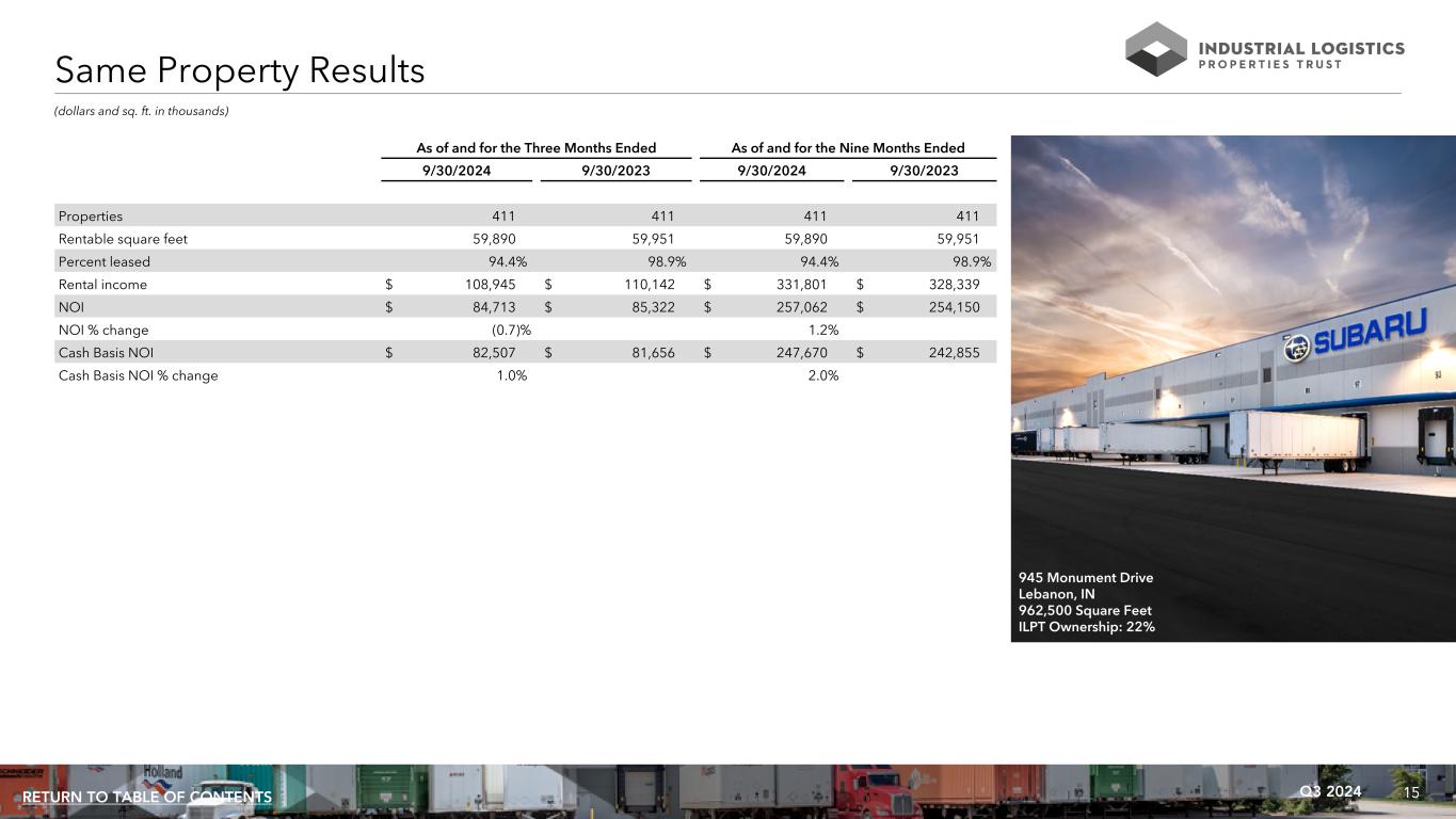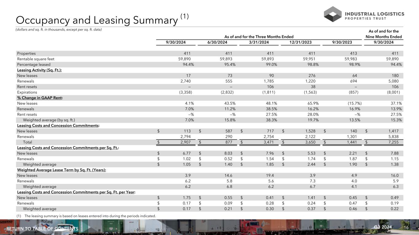 15Q3 2024RETURN TO TABLE OF CONTENTS (dollars and sq. ft. in thousands) As of and for the Three Months Ended As of and for the Nine Months Ended 9/30/2024 9/30/2023 9/30/2024 9/30/2023 Properties 411 411 411 411 Rentable square feet 59,890 59,951 59,890 59,951 Percent leased 94.4% 98.9% 94.4% 98.9% Rental income $ 108,945 $ 110,142 $ 331,801 $ 328,339 NOI $ 84,713 $ 85,322 $ 257,062 $ 254,150 NOI % change (0.7) % 1.2% Cash Basis NOI $ 82,507 $ 81,656 $ 247,670 $ 242,855 Cash Basis NOI % change 1.0% 2.0% Same Property Results 945 Monument Drive Lebanon, IN 962,500 Square Feet ILPT Ownership: 22%