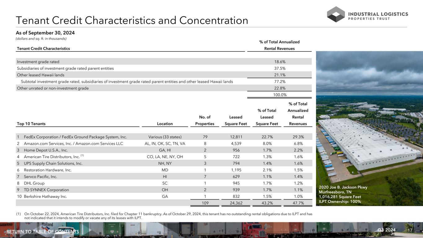 17Q3 2024RETURN TO TABLE OF CONTENTS As of September 30, 2024 % of Total Annualized Tenant Credit Characteristics Rental Revenues Investment grade rated 18.6% Subsidiaries of investment grade rated parent entities 37.5% Other leased Hawaii lands 21.1% Subtotal investment grade rated, subsidiaries of investment grade rated parent entities and other leased Hawaii lands 77.2% Other unrated or non-investment grade 22.8% 100.0% Tenant Credit Characteristics and Concentration % of Total % of Total Annualized No. of Leased Leased Rental Top 10 Tenants Location Properties Square Feet Square Feet Revenues 1 FedEx Corporation / FedEx Ground Package System, Inc. Various (33 states) 79 12,811 22.7% 29.3% 2 Amazon.com Services, Inc. / Amazon.com Services LLC AL, IN, OK, SC, TN, VA 8 4,539 8.0% 6.8% 3 Home Depot U.S.A., Inc. GA, HI 2 956 1.7% 2.2% 4 American Tire Distributors, Inc. (1) CO, LA, NE, NY, OH 5 722 1.3% 1.6% 5 UPS Supply Chain Solutions, Inc. NH, NY 3 794 1.4% 1.6% 6 Restoration Hardware, Inc. MD 1 1,195 2.1% 1.5% 7 Servco Pacific, Inc. HI 7 629 1.1% 1.4% 8 DHL Group SC 1 945 1.7% 1.2% 9 TD SYNNEX Corporation OH 2 939 1.7% 1.1% 10 Berkshire Hathaway Inc. GA 1 832 1.5% 1.0% 109 24,362 43.2% 47.7% (dollars and sq. ft. in thousands) 2020 Joe B. Jackson Pkwy Murfreesboro, TN 1,016,281 Square Feet ILPT Ownership: 100% (1) On October 22, 2024, American Tire Distributors, Inc. filed for Chapter 11 bankruptcy. As of October 29, 2024, this tenant has no outstanding rental obligations due to ILPT and has not indicated that it intends to modify or vacate any of its leases with ILPT.