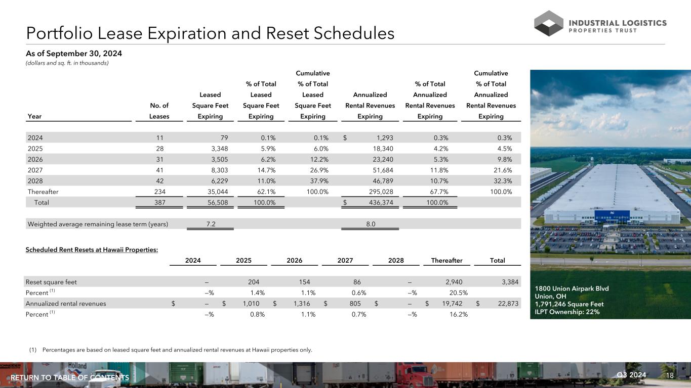 18Q3 2024RETURN TO TABLE OF CONTENTS Cumulative Cumulative % of Total % of Total % of Total % of Total Leased Leased Leased Annualized Annualized Annualized No. of Square Feet Square Feet Square Feet Rental Revenues Rental Revenues Rental Revenues Year Leases Expiring Expiring Expiring Expiring Expiring Expiring 2024 11 79 0.1% 0.1% $ 1,293 0.3% 0.3% 2025 28 3,348 5.9% 6.0% 18,340 4.2% 4.5% 2026 31 3,505 6.2% 12.2% 23,240 5.3% 9.8% 2027 41 8,303 14.7% 26.9% 51,684 11.8% 21.6% 2028 42 6,229 11.0% 37.9% 46,789 10.7% 32.3% Thereafter 234 35,044 62.1% 100.0% 295,028 67.7% 100.0% Total 387 56,508 100.0% $ 436,374 100.0% Weighted average remaining lease term (years) 7.2 8.0 Portfolio Lease Expiration and Reset Schedules (dollars and sq. ft. in thousands) As of September 30, 2024 Scheduled Rent Resets at Hawaii Properties: 2024 2025 2026 2027 2028 Thereafter Total Reset square feet — 204 154 86 — 2,940 3,384 Percent (1) —% 1.4% 1.1% 0.6% —% 20.5% Annualized rental revenues $ — $ 1,010 $ 1,316 $ 805 $ — $ 19,742 $ 22,873 Percent (1) —% 0.8% 1.1% 0.7% —% 16.2% (1) Percentages are based on leased square feet and annualized rental revenues at Hawaii properties only. 1800 Union Airpark Blvd Union, OH 1,791,246 Square Feet ILPT Ownership: 22%