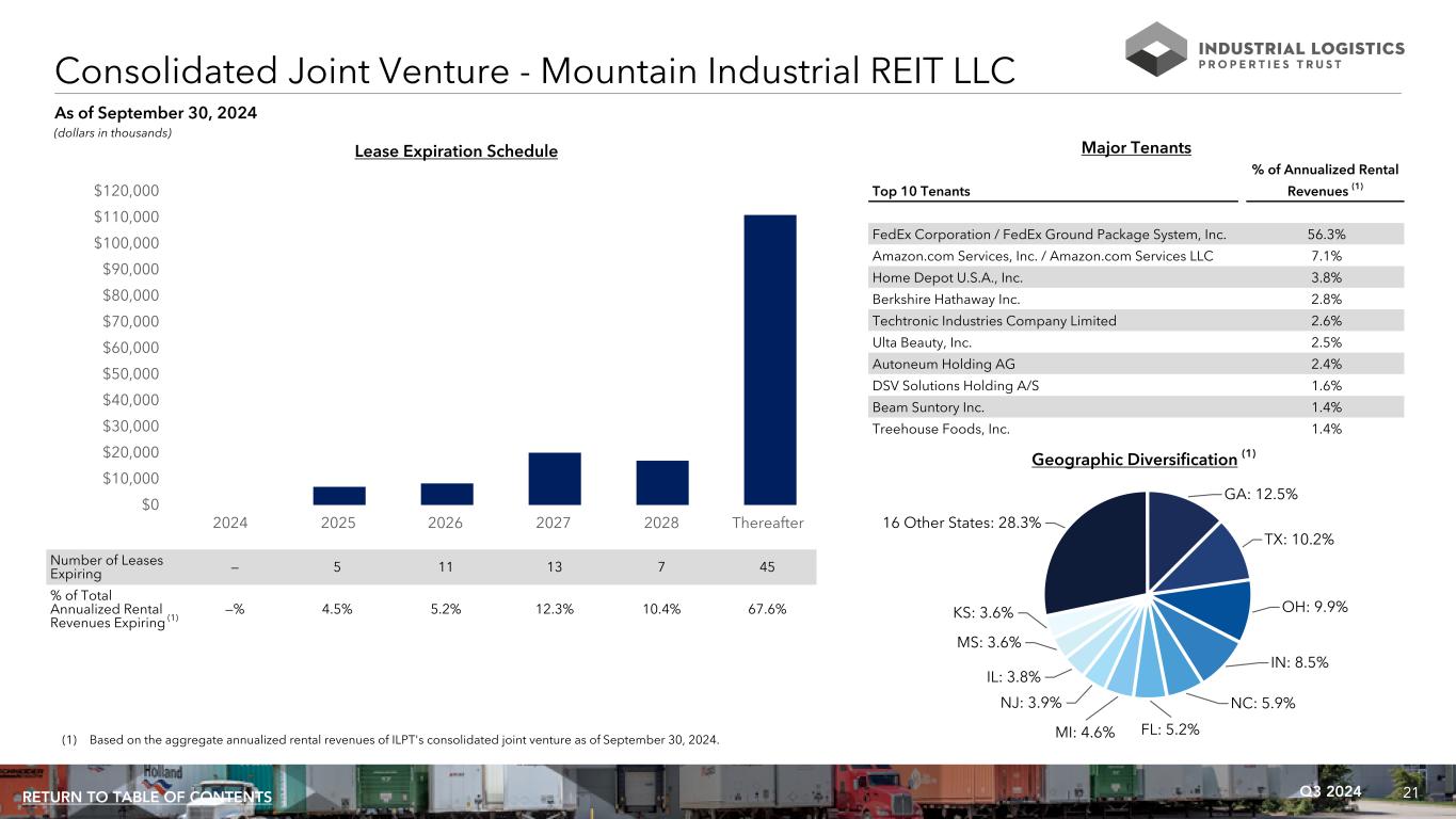 21Q3 2024RETURN TO TABLE OF CONTENTS GA: 12.5% TX: 10.2% OH: 9.9% IN: 8.5% NC: 5.9% FL: 5.2%MI: 4.6% NJ: 3.9% IL: 3.8% MS: 3.6% KS: 3.6% 16 Other States: 28.3% Consolidated Joint Venture - Mountain Industrial REIT LLC (dollars in thousands) Number of Leases Expiring — 5 11 13 7 45 % of Total Annualized Rental Revenues Expiring (1) —% 4.5% 5.2% 12.3% 10.4% 67.6% 2024 2025 2026 2027 2028 Thereafter $0 $10,000 $20,000 $30,000 $40,000 $50,000 $60,000 $70,000 $80,000 $90,000 $100,000 $110,000 $120,000 Lease Expiration Schedule As of September 30, 2024 Major Tenants % of Annualized Rental Top 10 Tenants Revenues (1) FedEx Corporation / FedEx Ground Package System, Inc. 56.3% Amazon.com Services, Inc. / Amazon.com Services LLC 7.1% Home Depot U.S.A., Inc. 3.8% Berkshire Hathaway Inc. 2.8% Techtronic Industries Company Limited 2.6% Ulta Beauty, Inc. 2.5% Autoneum Holding AG 2.4% DSV Solutions Holding A/S 1.6% Beam Suntory Inc. 1.4% Treehouse Foods, Inc. 1.4% Geographic Diversification (1) (1) Based on the aggregate annualized rental revenues of ILPT's consolidated joint venture as of September 30, 2024.