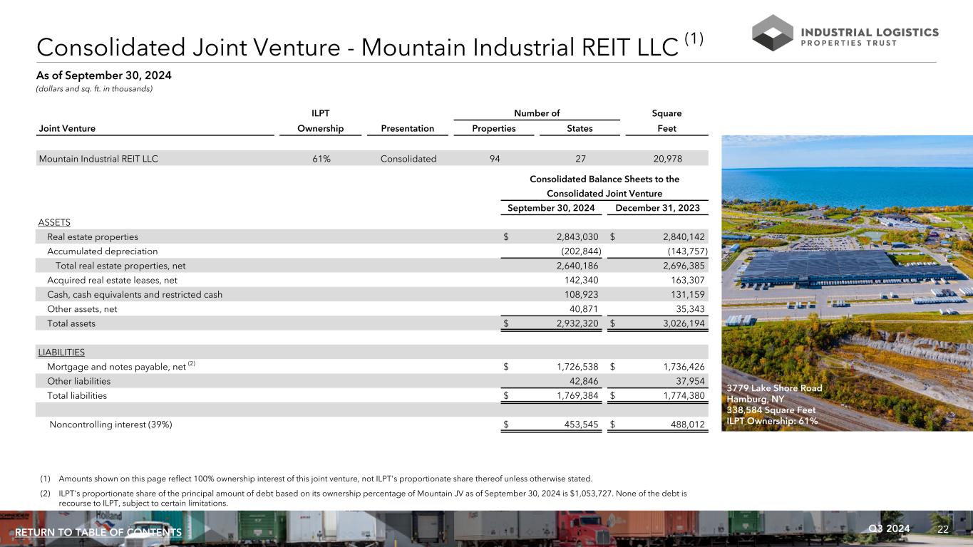22Q3 2024RETURN TO TABLE OF CONTENTS (dollars and sq. ft. in thousands) ILPT Number of Square Joint Venture Ownership Presentation Properties States Feet Mountain Industrial REIT LLC 61% Consolidated 94 27 20,978 (1) Amounts shown on this page reflect 100% ownership interest of this joint venture, not ILPT's proportionate share thereof unless otherwise stated. (2) ILPT's proportionate share of the principal amount of debt based on its ownership percentage of Mountain JV as of September 30, 2024 is $1,053,727. None of the debt is recourse to ILPT, subject to certain limitations. As of September 30, 2024 Consolidated Balance Sheets to the Consolidated Joint Venture September 30, 2024 December 31, 2023 ASSETS Real estate properties $ 2,843,030 $ 2,840,142 Accumulated depreciation (202,844) (143,757) Total real estate properties, net 2,640,186 2,696,385 Acquired real estate leases, net 142,340 163,307 Cash, cash equivalents and restricted cash 108,923 131,159 Other assets, net 40,871 35,343 Total assets $ 2,932,320 $ 3,026,194 LIABILITIES Mortgage and notes payable, net (2) $ 1,726,538 $ 1,736,426 Other liabilities 42,846 37,954 Total liabilities $ 1,769,384 $ 1,774,380 Noncontrolling interest (39%) $ 453,545 $ 488,012 Consolidated Joint Venture - Mountain Industrial REIT LLC (1) 3779 Lake Shore Road Hamburg, NY 338,584 Square Feet ILPT Ownership: 61%