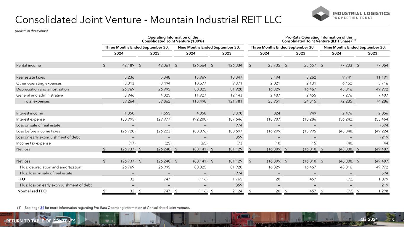 23Q3 2024RETURN TO TABLE OF CONTENTS Operating Information of the Consolidated Joint Venture (100%) Pro-Rata Operating Information of the Consolidated Joint Venture (ILPT Share) (1) Three Months Ended September 30, Nine Months Ended September 30, Three Months Ended September 30, Nine Months Ended September 30, 2024 2023 2024 2023 2024 2023 2024 2023 Rental income $ 42,189 $ 42,061 $ 126,564 $ 126,334 $ 25,735 $ 25,657 $ 77,203 $ 77,064 Real estate taxes 5,236 5,348 15,969 18,347 3,194 3,262 9,741 11,191 Other operating expenses 3,313 3,494 10,577 9,371 2,021 2,131 6,452 5,716 Depreciation and amortization 26,769 26,995 80,025 81,920 16,329 16,467 48,816 49,972 General and administrative 3,946 4,025 11,927 12,143 2,407 2,455 7,276 7,407 Total expenses 39,264 39,862 118,498 121,781 23,951 24,315 72,285 74,286 Interest income 1,350 1,555 4,058 3,370 824 949 2,476 2,056 Interest expense (30,995) (29,977) (92,200) (87,646) (18,907) (18,286) (56,242) (53,464) Loss on sale of real estate — — — (974) — — — (594) Loss before income taxes (26,720) (26,223) (80,076) (80,697) (16,299) (15,995) (48,848) (49,224) Loss on early extinguishment of debt — — — (359) — — — (219) Income tax expense (17) (25) (65) (73) (10) (15) (40) (44) Net loss $ (26,737) $ (26,248) $ (80,141) $ (81,129) $ (16,309) $ (16,010) $ (48,888) $ (49,487) Net loss $ (26,737) $ (26,248) $ (80,141) $ (81,129) $ (16,309) $ (16,010) $ (48,888) $ (49,487) Plus: depreciation and amortization 26,769 26,995 80,025 81,920 16,329 16,467 48,816 49,972 Plus: loss on sale of real estate — — — 974 — — — 594 FFO 32 747 (116) 1,765 20 457 (72) 1,079 Plus: loss on early extinguishment of debt — — — 359 — — — 219 Normalized FFO $ 32 $ 747 $ (116) $ 2,124 $ 20 $ 457 $ (72) $ 1,298 (dollars in thousands) (1) See page 34 for more information regarding Pro-Rata Operating Information of Consolidated Joint Venture. Consolidated Joint Venture - Mountain Industrial REIT LLC