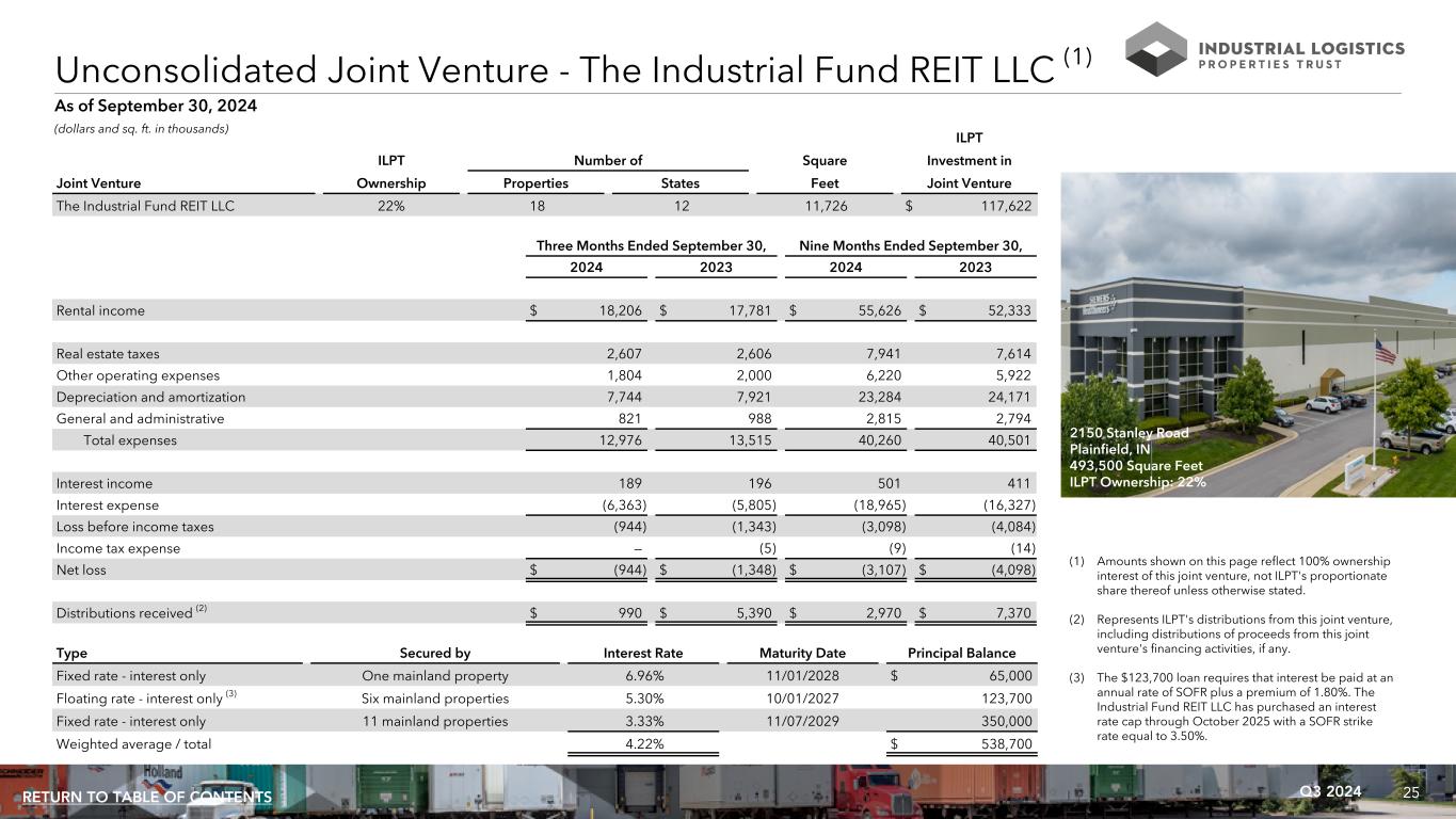 25Q3 2024RETURN TO TABLE OF CONTENTS Unconsolidated Joint Venture - The Industrial Fund REIT LLC (1) As of September 30, 2024 ILPT ILPT Number of Square Investment in Joint Venture Ownership Properties States Feet Joint Venture The Industrial Fund REIT LLC 22% 18 12 11,726 $ 117,622 Three Months Ended September 30, Nine Months Ended September 30, 2024 2023 2024 2023 Rental income $ 18,206 $ 17,781 $ 55,626 $ 52,333 Real estate taxes 2,607 2,606 7,941 7,614 Other operating expenses 1,804 2,000 6,220 5,922 Depreciation and amortization 7,744 7,921 23,284 24,171 General and administrative 821 988 2,815 2,794 Total expenses 12,976 13,515 40,260 40,501 Interest income 189 196 501 411 Interest expense (6,363) (5,805) (18,965) (16,327) Loss before income taxes (944) (1,343) (3,098) (4,084) Income tax expense — (5) (9) (14) Net loss $ (944) $ (1,348) $ (3,107) $ (4,098) Distributions received (2) $ 990 $ 5,390 $ 2,970 $ 7,370 Type Secured by Interest Rate Maturity Date Principal Balance Fixed rate - interest only One mainland property 6.96% 11/01/2028 $ 65,000 Floating rate - interest only (3) Six mainland properties 5.30% 10/01/2027 123,700 Fixed rate - interest only 11 mainland properties 3.33% 11/07/2029 350,000 Weighted average / total 4.22% $ 538,700 (1) Amounts shown on this page reflect 100% ownership interest of this joint venture, not ILPT's proportionate share thereof unless otherwise stated. (2) Represents ILPT's distributions from this joint venture, including distributions of proceeds from this joint venture's financing activities, if any. (3) The $123,700 loan requires that interest be paid at an annual rate of SOFR plus a premium of 1.80%. The Industrial Fund REIT LLC has purchased an interest rate cap through October 2025 with a SOFR strike rate equal to 3.50%. (dollars and sq. ft. in thousands) TO BE UPDATED 2150 Stanley Road Plainfield, IN 493,500 Square Feet ILPT Ownership: 22%