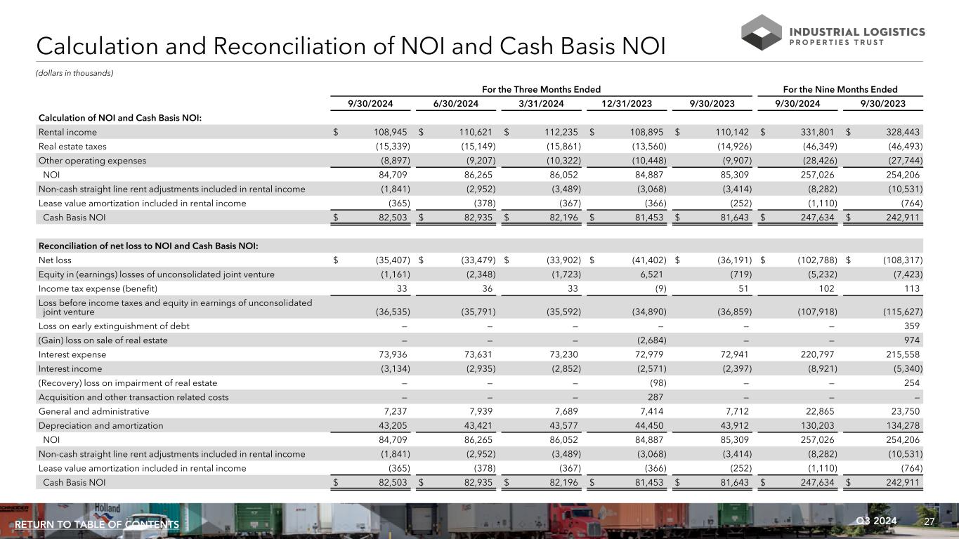 27Q3 2024RETURN TO TABLE OF CONTENTS Calculation and Reconciliation of NOI and Cash Basis NOI (dollars in thousands) For the Three Months Ended For the Nine Months Ended 9/30/2024 6/30/2024 3/31/2024 12/31/2023 9/30/2023 9/30/2024 9/30/2023 Calculation of NOI and Cash Basis NOI: Rental income $ 108,945 $ 110,621 $ 112,235 $ 108,895 $ 110,142 $ 331,801 $ 328,443 Real estate taxes (15,339) (15,149) (15,861) (13,560) (14,926) (46,349) (46,493) Other operating expenses (8,897) (9,207) (10,322) (10,448) (9,907) (28,426) (27,744) NOI 84,709 86,265 86,052 84,887 85,309 257,026 254,206 Non-cash straight line rent adjustments included in rental income (1,841) (2,952) (3,489) (3,068) (3,414) (8,282) (10,531) Lease value amortization included in rental income (365) (378) (367) (366) (252) (1,110) (764) Cash Basis NOI $ 82,503 $ 82,935 $ 82,196 $ 81,453 $ 81,643 $ 247,634 $ 242,911 Reconciliation of net loss to NOI and Cash Basis NOI: Net loss $ (35,407) $ (33,479) $ (33,902) $ (41,402) $ (36,191) $ (102,788) $ (108,317) Equity in (earnings) losses of unconsolidated joint venture (1,161) (2,348) (1,723) 6,521 (719) (5,232) (7,423) Income tax expense (benefit) 33 36 33 (9) 51 102 113 Loss before income taxes and equity in earnings of unconsolidated joint venture (36,535) (35,791) (35,592) (34,890) (36,859) (107,918) (115,627) Loss on early extinguishment of debt — — — — — — 359 (Gain) loss on sale of real estate — — — (2,684) — — 974 Interest expense 73,936 73,631 73,230 72,979 72,941 220,797 215,558 Interest income (3,134) (2,935) (2,852) (2,571) (2,397) (8,921) (5,340) (Recovery) loss on impairment of real estate — — — (98) — — 254 Acquisition and other transaction related costs — — — 287 — — — General and administrative 7,237 7,939 7,689 7,414 7,712 22,865 23,750 Depreciation and amortization 43,205 43,421 43,577 44,450 43,912 130,203 134,278 NOI 84,709 86,265 86,052 84,887 85,309 257,026 254,206 Non-cash straight line rent adjustments included in rental income (1,841) (2,952) (3,489) (3,068) (3,414) (8,282) (10,531) Lease value amortization included in rental income (365) (378) (367) (366) (252) (1,110) (764) Cash Basis NOI $ 82,503 $ 82,935 $ 82,196 $ 81,453 $ 81,643 $ 247,634 $ 242,911