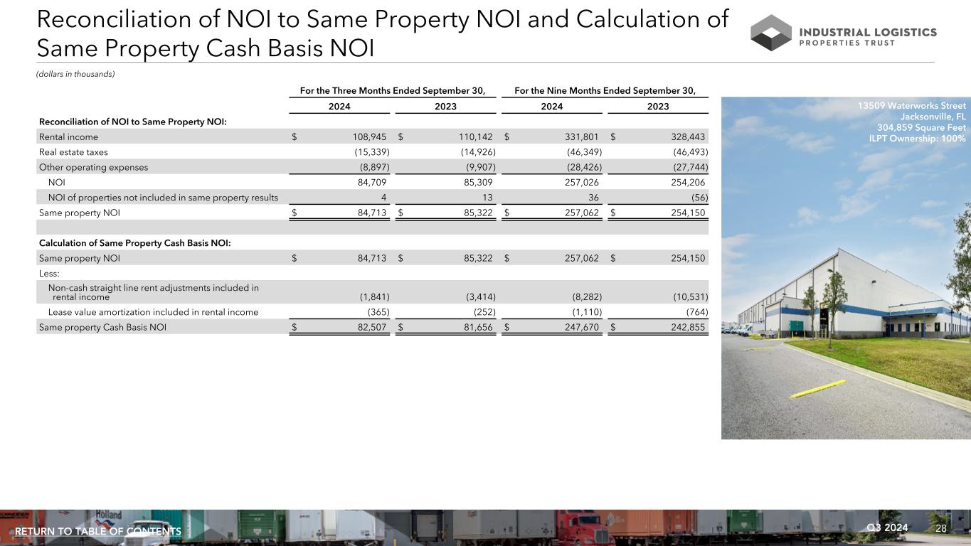28Q3 2024RETURN TO TABLE OF CONTENTS Reconciliation of NOI to Same Property NOI and Calculation of Same Property Cash Basis NOI (dollars in thousands) For the Three Months Ended September 30, For the Nine Months Ended September 30, 2024 2023 2024 2023 Reconciliation of NOI to Same Property NOI: Rental income $ 108,945 $ 110,142 $ 331,801 $ 328,443 Real estate taxes (15,339) (14,926) (46,349) (46,493) Other operating expenses (8,897) (9,907) (28,426) (27,744) NOI 84,709 85,309 257,026 254,206 NOI of properties not included in same property results 4 13 36 (56) Same property NOI $ 84,713 $ 85,322 $ 257,062 $ 254,150 Calculation of Same Property Cash Basis NOI: Same property NOI $ 84,713 $ 85,322 $ 257,062 $ 254,150 Less: Non-cash straight line rent adjustments included in rental income (1,841) (3,414) (8,282) (10,531) Lease value amortization included in rental income (365) (252) (1,110) (764) Same property Cash Basis NOI $ 82,507 $ 81,656 $ 247,670 $ 242,855 13509 Waterworks Street Jacksonville, FL 304,859 Square Feet ILPT Ownership: 100%