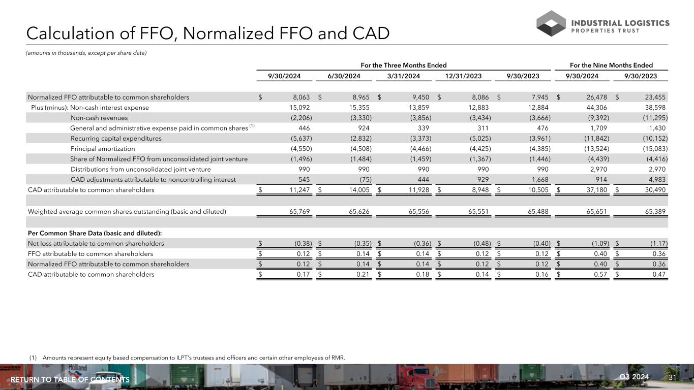 31Q3 2024RETURN TO TABLE OF CONTENTS (amounts in thousands, except per share data) For the Three Months Ended For the Nine Months Ended 9/30/2024 6/30/2024 3/31/2024 12/31/2023 9/30/2023 9/30/2024 9/30/2023 Normalized FFO attributable to common shareholders $ 8,063 $ 8,965 $ 9,450 $ 8,086 $ 7,945 $ 26,478 $ 23,455 Plus (minus): Non-cash interest expense 15,092 15,355 13,859 12,883 12,884 44,306 38,598 Non-cash revenues (2,206) (3,330) (3,856) (3,434) (3,666) (9,392) (11,295) General and administrative expense paid in common shares (1) 446 924 339 311 476 1,709 1,430 Recurring capital expenditures (5,637) (2,832) (3,373) (5,025) (3,961) (11,842) (10,152) Principal amortization (4,550) (4,508) (4,466) (4,425) (4,385) (13,524) (15,083) Share of Normalized FFO from unconsolidated joint venture (1,496) (1,484) (1,459) (1,367) (1,446) (4,439) (4,416) Distributions from unconsolidated joint venture 990 990 990 990 990 2,970 2,970 CAD adjustments attributable to noncontrolling interest 545 (75) 444 929 1,668 914 4,983 CAD attributable to common shareholders $ 11,247 $ 14,005 $ 11,928 $ 8,948 $ 10,505 $ 37,180 $ 30,490 Weighted average common shares outstanding (basic and diluted) 65,769 65,626 65,556 65,551 65,488 65,651 65,389 Per Common Share Data (basic and diluted): Net loss attributable to common shareholders $ (0.38) $ (0.35) $ (0.36) $ (0.48) $ (0.40) $ (1.09) $ (1.17) FFO attributable to common shareholders $ 0.12 $ 0.14 $ 0.14 $ 0.12 $ 0.12 $ 0.40 $ 0.36 Normalized FFO attributable to common shareholders $ 0.12 $ 0.14 $ 0.14 $ 0.12 $ 0.12 $ 0.40 $ 0.36 CAD attributable to common shareholders $ 0.17 $ 0.21 $ 0.18 $ 0.14 $ 0.16 $ 0.57 $ 0.47 (1) Amounts represent equity based compensation to ILPT's trustees and officers and certain other employees of RMR. Calculation of FFO, Normalized FFO and CAD