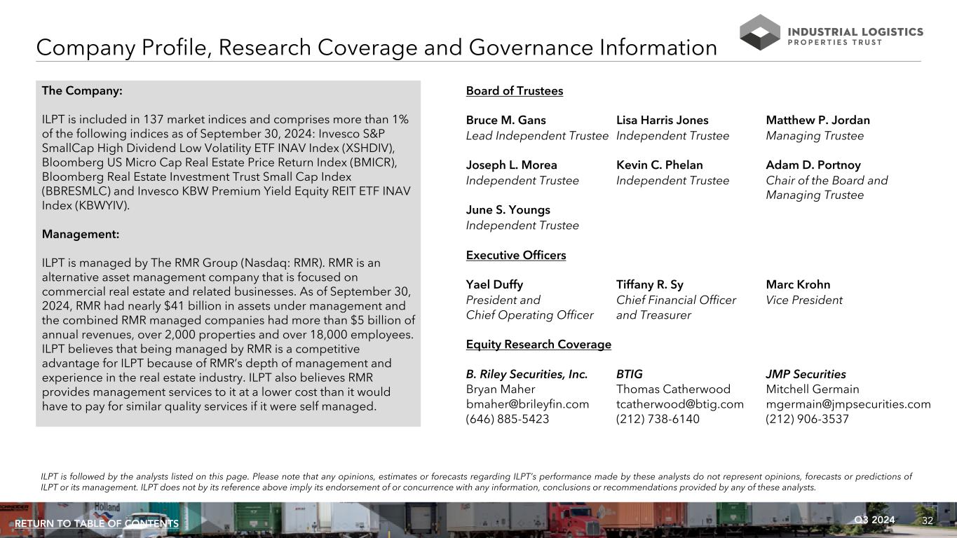 32Q3 2024RETURN TO TABLE OF CONTENTS Company Profile, Research Coverage and Governance Information The Company: ILPT is included in 137 market indices and comprises more than 1% of the following indices as of September 30, 2024: Invesco S&P SmallCap High Dividend Low Volatility ETF INAV Index (XSHDIV), Bloomberg US Micro Cap Real Estate Price Return Index (BMICR), Bloomberg Real Estate Investment Trust Small Cap Index (BBRESMLC) and Invesco KBW Premium Yield Equity REIT ETF INAV Index (KBWYIV). Management: ILPT is managed by The RMR Group (Nasdaq: RMR). RMR is an alternative asset management company that is focused on commercial real estate and related businesses. As of September 30, 2024, RMR had nearly $41 billion in assets under management and the combined RMR managed companies had more than $5 billion of annual revenues, over 2,000 properties and over 18,000 employees. ILPT believes that being managed by RMR is a competitive advantage for ILPT because of RMR’s depth of management and experience in the real estate industry. ILPT also believes RMR provides management services to it at a lower cost than it would have to pay for similar quality services if it were self managed. Board of Trustees Bruce M. Gans Lisa Harris Jones Matthew P. Jordan Lead Independent Trustee Independent Trustee Managing Trustee Joseph L. Morea Kevin C. Phelan Adam D. Portnoy Independent Trustee Independent Trustee Chair of the Board and Managing Trustee June S. Youngs Independent Trustee Executive Officers Yael Duffy Tiffany R. Sy Marc Krohn President and Chief Financial Officer Vice President Chief Operating Officer and Treasurer Equity Research Coverage B. Riley Securities, Inc. BTIG JMP Securities Bryan Maher Thomas Catherwood Mitchell Germain bmaher@brileyfin.com tcatherwood@btig.com mgermain@jmpsecurities.com (646) 885-5423 (212) 738-6140 (212) 906-3537 ILPT is followed by the analysts listed on this page. Please note that any opinions, estimates or forecasts regarding ILPT’s performance made by these analysts do not represent opinions, forecasts or predictions of ILPT or its management. ILPT does not by its reference above imply its endorsement of or concurrence with any information, conclusions or recommendations provided by any of these analysts.