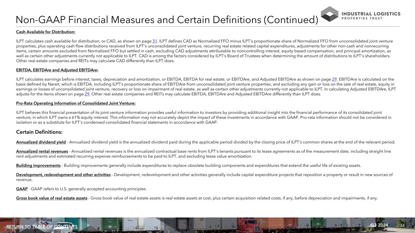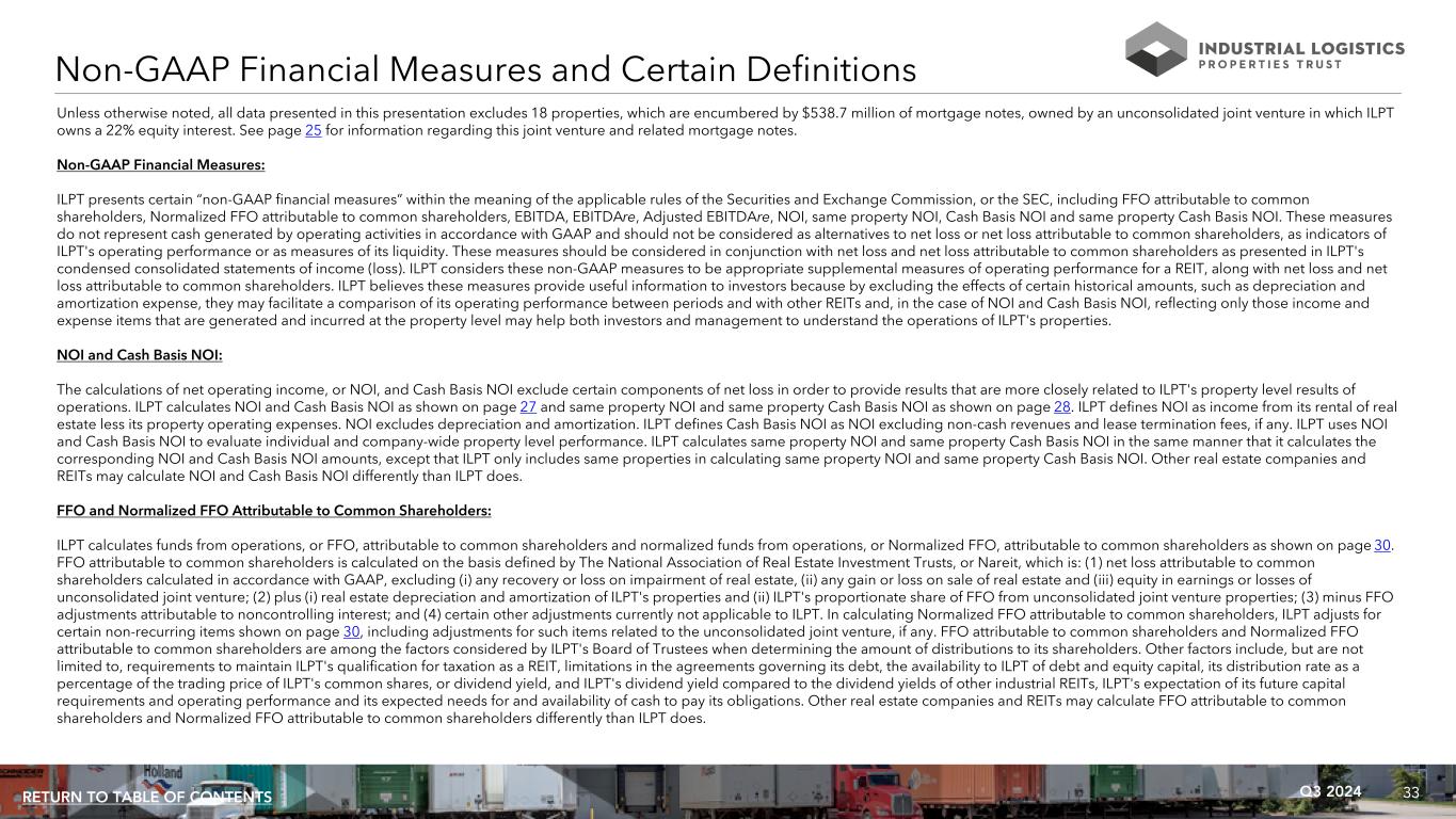 33Q3 2024RETURN TO TABLE OF CONTENTS Unless otherwise noted, all data presented in this presentation excludes 18 properties, which are encumbered by $538.7 million of mortgage notes, owned by an unconsolidated joint venture in which ILPT owns a 22% equity interest. See page 25 for information regarding this joint venture and related mortgage notes. Non-GAAP Financial Measures: ILPT presents certain “non-GAAP financial measures” within the meaning of the applicable rules of the Securities and Exchange Commission, or the SEC, including FFO attributable to common shareholders, Normalized FFO attributable to common shareholders, EBITDA, EBITDAre, Adjusted EBITDAre, NOI, same property NOI, Cash Basis NOI and same property Cash Basis NOI. These measures do not represent cash generated by operating activities in accordance with GAAP and should not be considered as alternatives to net loss or net loss attributable to common shareholders, as indicators of ILPT's operating performance or as measures of its liquidity. These measures should be considered in conjunction with net loss and net loss attributable to common shareholders as presented in ILPT's condensed consolidated statements of income (loss). ILPT considers these non-GAAP measures to be appropriate supplemental measures of operating performance for a REIT, along with net loss and net loss attributable to common shareholders. ILPT believes these measures provide useful information to investors because by excluding the effects of certain historical amounts, such as depreciation and amortization expense, they may facilitate a comparison of its operating performance between periods and with other REITs and, in the case of NOI and Cash Basis NOI, reflecting only those income and expense items that are generated and incurred at the property level may help both investors and management to understand the operations of ILPT's properties. NOI and Cash Basis NOI: The calculations of net operating income, or NOI, and Cash Basis NOI exclude certain components of net loss in order to provide results that are more closely related to ILPT's property level results of operations. ILPT calculates NOI and Cash Basis NOI as shown on page 27 and same property NOI and same property Cash Basis NOI as shown on page 28. ILPT defines NOI as income from its rental of real estate less its property operating expenses. NOI excludes depreciation and amortization. ILPT defines Cash Basis NOI as NOI excluding non-cash revenues and lease termination fees, if any. ILPT uses NOI and Cash Basis NOI to evaluate individual and company-wide property level performance. ILPT calculates same property NOI and same property Cash Basis NOI in the same manner that it calculates the corresponding NOI and Cash Basis NOI amounts, except that ILPT only includes same properties in calculating same property NOI and same property Cash Basis NOI. Other real estate companies and REITs may calculate NOI and Cash Basis NOI differently than ILPT does. FFO and Normalized FFO Attributable to Common Shareholders: ILPT calculates funds from operations, or FFO, attributable to common shareholders and normalized funds from operations, or Normalized FFO, attributable to common shareholders as shown on page 30. FFO attributable to common shareholders is calculated on the basis defined by The National Association of Real Estate Investment Trusts, or Nareit, which is: (1) net loss attributable to common shareholders calculated in accordance with GAAP, excluding (i) any recovery or loss on impairment of real estate, (ii) any gain or loss on sale of real estate and (iii) equity in earnings or losses of unconsolidated joint venture; (2) plus (i) real estate depreciation and amortization of ILPT's properties and (ii) ILPT's proportionate share of FFO from unconsolidated joint venture properties; (3) minus FFO adjustments attributable to noncontrolling interest; and (4) certain other adjustments currently not applicable to ILPT. In calculating Normalized FFO attributable to common shareholders, ILPT adjusts for certain non-recurring items shown on page 30, including adjustments for such items related to the unconsolidated joint venture, if any. FFO attributable to common shareholders and Normalized FFO attributable to common shareholders are among the factors considered by ILPT's Board of Trustees when determining the amount of distributions to its shareholders. Other factors include, but are not limited to, requirements to maintain ILPT's qualification for taxation as a REIT, limitations in the agreements governing its debt, the availability to ILPT of debt and equity capital, its distribution rate as a percentage of the trading price of ILPT's common shares, or dividend yield, and ILPT's dividend yield compared to the dividend yields of other industrial REITs, ILPT's expectation of its future capital requirements and operating performance and its expected needs for and availability of cash to pay its obligations. Other real estate companies and REITs may calculate FFO attributable to common shareholders and Normalized FFO attributable to common shareholders differently than ILPT does. Non-GAAP Financial Measures and Certain Definitions
