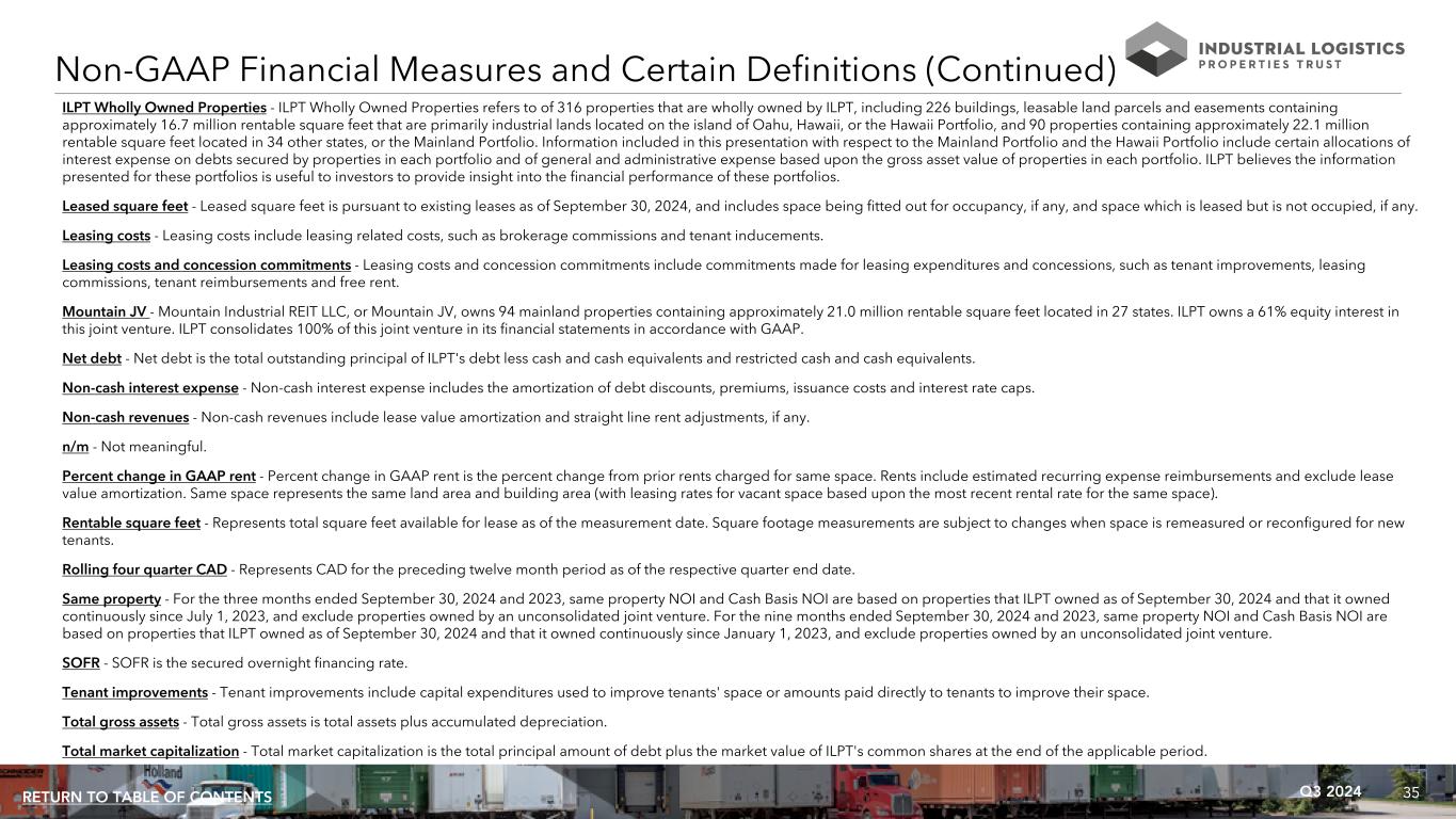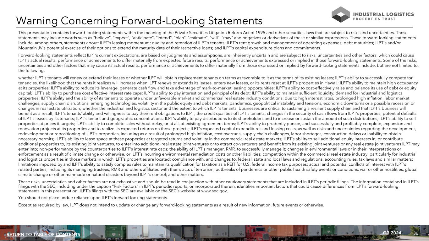 35Q3 2024RETURN TO TABLE OF CONTENTS ILPT Wholly Owned Properties - ILPT Wholly Owned Properties refers to of 316 properties that are wholly owned by ILPT, including 226 buildings, leasable land parcels and easements containing approximately 16.7 million rentable square feet that are primarily industrial lands located on the island of Oahu, Hawaii, or the Hawaii Portfolio, and 90 properties containing approximately 22.1 million rentable square feet located in 34 other states, or the Mainland Portfolio. Information included in this presentation with respect to the Mainland Portfolio and the Hawaii Portfolio include certain allocations of interest expense on debts secured by properties in each portfolio and of general and administrative expense based upon the gross asset value of properties in each portfolio. ILPT believes the information presented for these portfolios is useful to investors to provide insight into the financial performance of these portfolios. Leased square feet - Leased square feet is pursuant to existing leases as of September 30, 2024, and includes space being fitted out for occupancy, if any, and space which is leased but is not occupied, if any. Leasing costs - Leasing costs include leasing related costs, such as brokerage commissions and tenant inducements. Leasing costs and concession commitments - Leasing costs and concession commitments include commitments made for leasing expenditures and concessions, such as tenant improvements, leasing commissions, tenant reimbursements and free rent. Mountain JV - Mountain Industrial REIT LLC, or Mountain JV, owns 94 mainland properties containing approximately 21.0 million rentable square feet located in 27 states. ILPT owns a 61% equity interest in this joint venture. ILPT consolidates 100% of this joint venture in its financial statements in accordance with GAAP. Net debt - Net debt is the total outstanding principal of ILPT's debt less cash and cash equivalents and restricted cash and cash equivalents. Non-cash interest expense - Non-cash interest expense includes the amortization of debt discounts, premiums, issuance costs and interest rate caps. Non-cash revenues - Non-cash revenues include lease value amortization and straight line rent adjustments, if any. n/m - Not meaningful. Percent change in GAAP rent - Percent change in GAAP rent is the percent change from prior rents charged for same space. Rents include estimated recurring expense reimbursements and exclude lease value amortization. Same space represents the same land area and building area (with leasing rates for vacant space based upon the most recent rental rate for the same space). Rentable square feet - Represents total square feet available for lease as of the measurement date. Square footage measurements are subject to changes when space is remeasured or reconfigured for new tenants. Rolling four quarter CAD - Represents CAD for the preceding twelve month period as of the respective quarter end date. Same property - For the three months ended September 30, 2024 and 2023, same property NOI and Cash Basis NOI are based on properties that ILPT owned as of September 30, 2024 and that it owned continuously since July 1, 2023, and exclude properties owned by an unconsolidated joint venture. For the nine months ended September 30, 2024 and 2023, same property NOI and Cash Basis NOI are based on properties that ILPT owned as of September 30, 2024 and that it owned continuously since January 1, 2023, and exclude properties owned by an unconsolidated joint venture. SOFR - SOFR is the secured overnight financing rate. Tenant improvements - Tenant improvements include capital expenditures used to improve tenants' space or amounts paid directly to tenants to improve their space. Total gross assets - Total gross assets is total assets plus accumulated depreciation. Total market capitalization - Total market capitalization is the total principal amount of debt plus the market value of ILPT's common shares at the end of the applicable period. Non-GAAP Financial Measures and Certain Definitions (Continued)