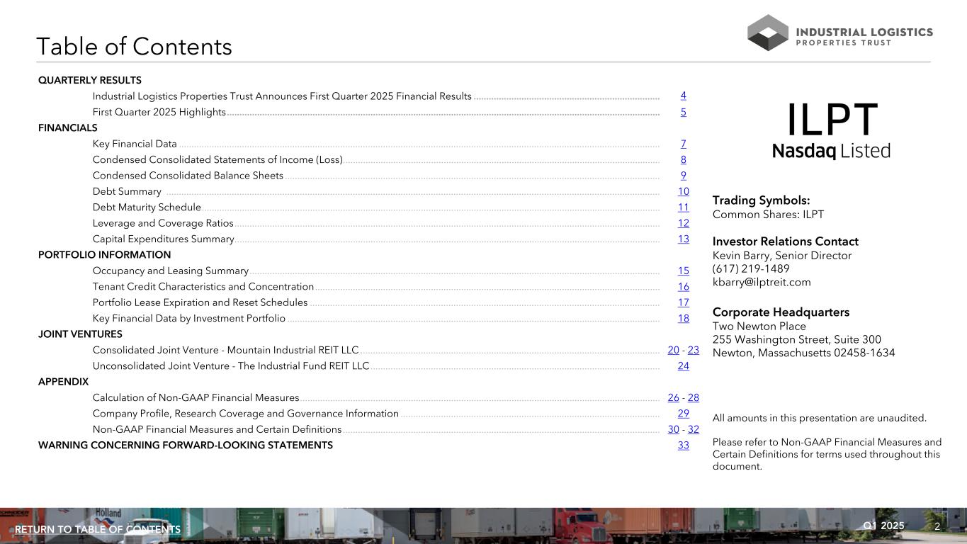 2Q1 2025RETURN TO TABLE OF CONTENTS QUARTERLY RESULTS Industrial Logistics Properties Trust Announces First Quarter 2025 Financial Results .......................................................................... 4 First Quarter 2025 Highlights ............................................................................................................................................................................ 5 FINANCIALS Key Financial Data ............................................................................................................................................................................................... 7 Condensed Consolidated Statements of Income (Loss) .............................................................................................................................. 8 Condensed Consolidated Balance Sheets ..................................................................................................................................................... 9 Debt Summary .................................................................................................................................................................................................... 10 Debt Maturity Schedule ...................................................................................................................................................................................... 11 Leverage and Coverage Ratios ......................................................................................................................................................................... 12 Capital Expenditures Summary ......................................................................................................................................................................... 13 PORTFOLIO INFORMATION Occupancy and Leasing Summary ................................................................................................................................................................... 15 Tenant Credit Characteristics and Concentration ......................................................................................................................................... 16 Portfolio Lease Expiration and Reset Schedules ........................................................................................................................................... 17 Key Financial Data by Investment Portfolio .................................................................................................................................................... 18 JOINT VENTURES Consolidated Joint Venture - Mountain Industrial REIT LLC ....................................................................................................................... 20 - 23 Unconsolidated Joint Venture - The Industrial Fund REIT LLC ................................................................................................................... 24 APPENDIX Calculation of Non-GAAP Financial Measures ............................................................................................................................................... 26 - 28 Company Profile, Research Coverage and Governance Information ....................................................................................................... 29 Non-GAAP Financial Measures and Certain Definitions .............................................................................................................................. 30 - 32 WARNING CONCERNING FORWARD-LOOKING STATEMENTS 33 Table of Contents All amounts in this presentation are unaudited. Please refer to Non-GAAP Financial Measures and Certain Definitions for terms used throughout this document. Trading Symbols: Common Shares: ILPT Investor Relations Contact Kevin Barry, Senior Director (617) 219-1489 kbarry@ilptreit.com Corporate Headquarters Two Newton Place 255 Washington Street, Suite 300 Newton, Massachusetts 02458-1634