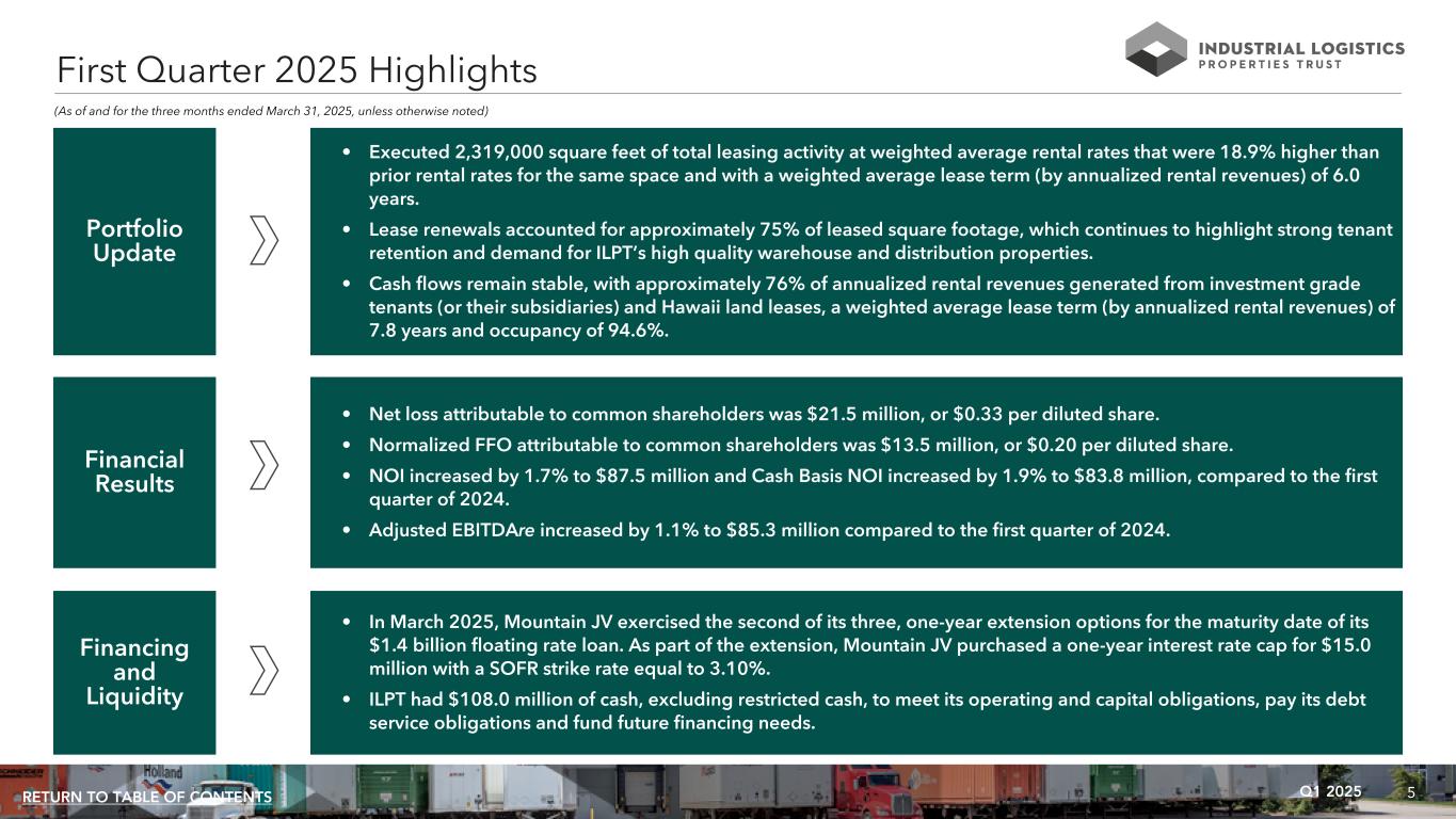 33Q1 2025RETURN TO TABLE OF CONTENTS Warning Concerning Forward-Looking Statements This presentation contains forward-looking statements within the meaning of the Private Securities Litigation Reform Act of 1995 and other securities laws that are subject to risks and uncertainties. These statements may include words such as “believe”, “expect”, “anticipate”, “intend”, “plan”, “estimate”, “will”, “may” and negatives or derivatives of these or similar expressions. These forward-looking statements include, among others, statements about: ILPT's operating fundamentals and leasing velocity; ILPT's ability to realize organic cash flow growth and maintain portfolio stability; tenant retention at and demand for ILPT's properties; debt maturities; ILPT's and/or Mountain JV's potential exercise of extension options for the maturity date of loans; and ILPT’s capital expenditure plans and commitments. Forward-looking statements reflect ILPT’s current expectations, are based on judgments and assumptions, are inherently uncertain and are subject to risks, uncertainties and other factors, which could cause ILPT’s actual results, performance or achievements to differ materially from expected future results, performance or achievements expressed or implied in those forward-looking statements. Some of the risks, uncertainties and other factors that may cause its actual results, performance or achievements to differ materially from those expressed or implied by forward-looking statements include, but are not limited to, the following: whether ILPT's tenants will renew or extend their leases or whether ILPT will obtain replacement tenants on terms as favorable to it as the terms of its existing leases; ILPT's ability to successfully compete for tenancies, the likelihood that the rents it realizes will increase when ILPT renews or extends its leases, enters new leases, or its rents reset at ILPT’s properties located in Hawaii; ILPT’s ability to maintain high occupancy at its properties; ILPT’s ability to reduce its leverage, generate cash flow and take advantage of mark-to-market leasing opportunities; ILPT's ability to cost-effectively raise and balance its use of debt or equity capital; ILPT’s ability to pay interest on and principal of its debt; ILPT’s ability to purchase cost effective interest rate caps; ILPT's expected capital expenditures and leasing costs; ILPT’s ability to maintain sufficient liquidity; demand for industrial and logistics properties; ILPT’s ability and the ability of its tenants to operate under unfavorable market and commercial real estate industry conditions, due to uncertainties surrounding interest rates and inflation, effect of or changes to tariffs or trading policies, supply chain disruptions, emerging technologies, volatility in the public equity and debt markets, pandemics, geopolitical instability and tensions, economic downturns or a possible recession, labor market conditions or changes in real estate utilization; whether the industrial and logistics sector and the extent to which ILPT's tenants' businesses are critical to sustaining a resilient supply chain and that ILPT's business will benefit as a result; ILPT’s tenants’ ability and willingness to pay their rent obligations to ILPT; the credit qualities of ILPT’s tenants; changes in the security of cash flows from ILPT’s properties; potential defaults of ILPT's leases by its tenants; ILPT's tenant and geographic concentrations; ILPT’s ability to pay distributions to its shareholders and to increase or sustain the amount of such distributions; ILPT’s ability to sell properties at prices or returns it targets, and the timing of such sales; ILPT's ability to complete sales without delay, or at all, pursuant to existing agreement terms; ILPT’s ability to prudently pursue, and successfully and profitably complete, expansion and renovation projects at its properties and to realize its expected returns on those projects; risks and uncertainties regarding the development, redevelopment or repositioning of ILPT’s properties, including as a result of inflation, cost overruns, tariffs, supply chain challenges, labor market conditions, construction delays or ILPT's inability to obtain necessary permits; ILPT’s ability to lease space at these properties at targeted returns and volatility in the commercial real estate markets; ILPT’s ability to sell additional equity interests in, or contribute additional properties to, its existing joint ventures, to enter into additional real estate joint ventures or to attract co-venturers and benefit from its existing joint ventures or any real estate joint ventures ILPT may enter into; non-performance by the counterparties to ILPT's interest rate caps; the ability of ILPT’s manager, RMR, to successfully manage it; changes in environmental laws or in their interpretations or enforcement as a result of climate change or otherwise, or ILPT’s incurring environmental remediation costs or other liabilities; competition within the commercial real estate industry, particularly for industrial and logistics properties in those markets in which ILPT’s properties are located; compliance with, and changes to, federal, state and local laws and regulations, accounting rules, tax laws and similar matters; limitations imposed by and ILPT’s ability to satisfy complex rules to maintain its qualification for taxation as a REIT for U.S. federal income tax purposes; actual and potential conflicts of interest with ILPT’s related parties, including its managing trustees, RMR and others affiliated with them; acts of terrorism, outbreaks of pandemics or other public health safety events or conditions, war or other hostilities, global climate change or other manmade or natural disasters beyond ILPT's control; and other matters. These risks, uncertainties and other factors are not exhaustive and should be read in conjunction with other caut