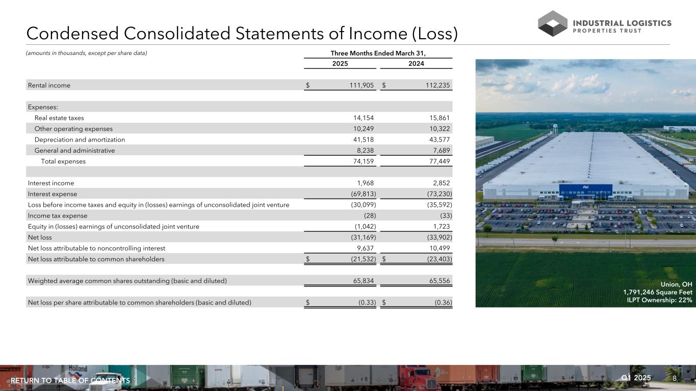 8Q1 2025RETURN TO TABLE OF CONTENTS Condensed Consolidated Statements of Income (Loss) Three Months Ended March 31, 2025 2024 Rental income $ 111,905 $ 112,235 Expenses: Real estate taxes 14,154 15,861 Other operating expenses 10,249 10,322 Depreciation and amortization 41,518 43,577 General and administrative 8,238 7,689 Total expenses 74,159 77,449 Interest income 1,968 2,852 Interest expense (69,813) (73,230) Loss before income taxes and equity in (losses) earnings of unconsolidated joint venture (30,099) (35,592) Income tax expense (28) (33) Equity in (losses) earnings of unconsolidated joint venture (1,042) 1,723 Net loss (31,169) (33,902) Net loss attributable to noncontrolling interest 9,637 10,499 Net loss attributable to common shareholders $ (21,532) $ (23,403) Weighted average common shares outstanding (basic and diluted) 65,834 65,556 Net loss per share attributable to common shareholders (basic and diluted) $ (0.33) $ (0.36) (amounts in thousands, except per share data) Union, OH 1,791,246 Square Feet ILPT Ownership: 22%