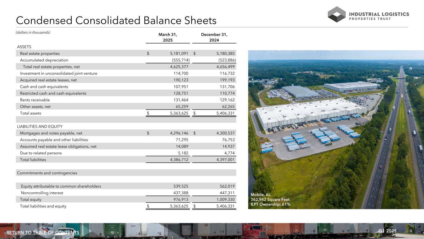9Q1 2025RETURN TO TABLE OF CONTENTS Condensed Consolidated Balance Sheets March 31, December 31, 2025 2024 ASSETS Real estate properties $ 5,181,091 $ 5,180,385 Accumulated depreciation (555,714) (523,886) Total real estate properties, net 4,625,377 4,656,499 Investment in unconsolidated joint venture 114,700 116,732 Acquired real estate leases, net 190,123 199,193 Cash and cash equivalents 107,951 131,706 Restricted cash and cash equivalents 128,751 110,774 Rents receivable 131,464 129,162 Other assets, net 65,259 62,265 Total assets $ 5,363,625 $ 5,406,331 LIABILITIES AND EQUITY Mortgages and notes payable, net $ 4,296,146 $ 4,300,537 Accounts payable and other liabilities 71,295 76,753 Assumed real estate lease obligations, net 14,089 14,937 Due to related persons 5,182 4,774 Total liabilities 4,386,712 4,397,001 Commitments and contingencies Equity attributable to common shareholders 539,525 562,019 Noncontrolling interest 437,388 447,311 Total equity 976,913 1,009,330 Total liabilities and equity $ 5,363,625 $ 5,406,331 (dollars in thousands) Mobile, AL 362,942 Square Feet ILPT Ownership: 61%