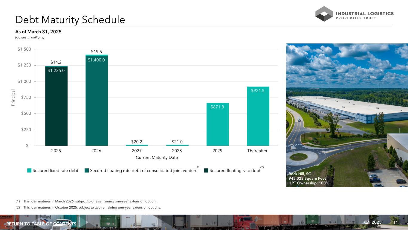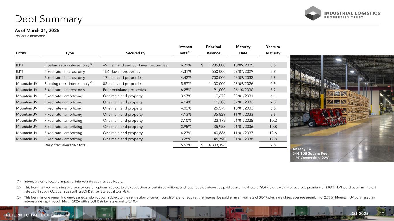 10Q1 2025RETURN TO TABLE OF CONTENTS (1) Interest rates reflect the impact of interest rate caps, as applicable. (2) This loan has two remaining one-year extension options, subject to the satisfaction of certain conditions, and requires that interest be paid at an annual rate of SOFR plus a weighted average premium of 3.93%. ILPT purchased an interest rate cap through October 2025 with a SOFR strike rate equal to 2.78%. (3) This loan has one remaining one-year extension option, subject to the satisfaction of certain conditions, and requires that interest be paid at an annual rate of SOFR plus a weighted average premium of 2.77%. Mountain JV purchased an interest rate cap through March 2026 with a SOFR strike rate equal to 3.10%. Interest Principal Maturity Years to Entity Type Secured By Rate (1) Balance Date Maturity ILPT Floating rate - interest only (2) 69 mainland and 35 Hawaii properties 6.71% $ 1,235,000 10/09/2025 0.5 ILPT Fixed rate - interest only 186 Hawaii properties 4.31% 650,000 02/07/2029 3.9 ILPT Fixed rate - interest only 17 mainland properties 4.42% 700,000 03/09/2032 6.9 Mountain JV Floating rate - interest only (3) 82 mainland properties 5.87% 1,400,000 03/09/2026 0.9 Mountain JV Fixed rate - interest only Four mainland properties 6.25% 91,000 06/10/2030 5.2 Mountain JV Fixed rate - amortizing One mainland property 3.67% 9,672 05/01/2031 6.1 Mountain JV Fixed rate - amortizing One mainland property 4.14% 11,308 07/01/2032 7.3 Mountain JV Fixed rate - amortizing One mainland property 4.02% 25,579 10/01/2033 8.5 Mountain JV Fixed rate - amortizing One mainland property 4.13% 35,829 11/01/2033 8.6 Mountain JV Fixed rate - amortizing One mainland property 3.10% 22,179 06/01/2035 10.2 Mountain JV Fixed rate - amortizing One mainland property 2.95% 35,953 01/01/2036 10.8 Mountain JV Fixed rate - amortizing One mainland property 4.27% 40,886 11/01/2037 12.6 Mountain JV Fixed rate - amortizing One mainland property 3.25% 45,790 01/01/2038 12.8 Weighted average / total 5.53% $ 4,303,196 2.8 Debt Summary (dollars in thousands) As of March 31, 2025 Ankeny, IA 644,108 Square Feet ILPT Ownership: 22%