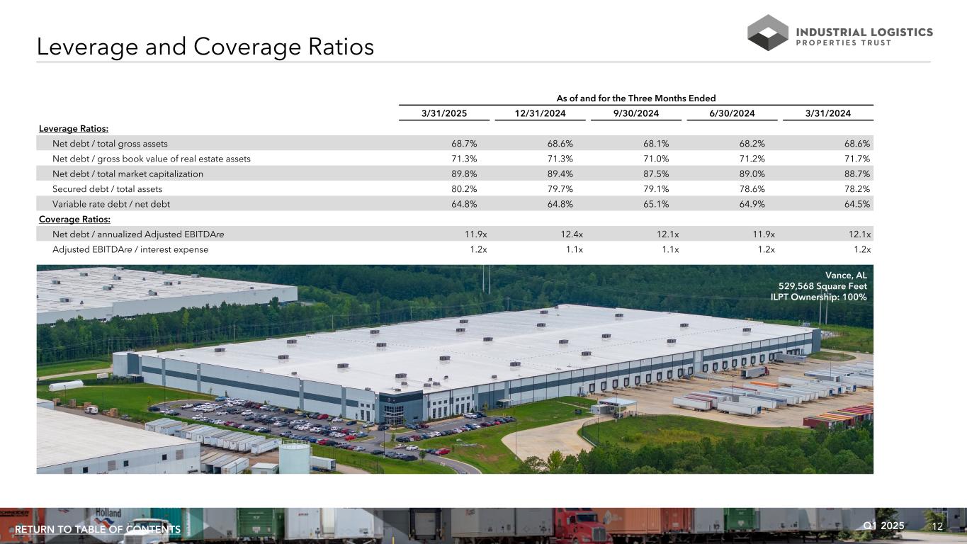 12Q1 2025RETURN TO TABLE OF CONTENTS As of and for the Three Months Ended 3/31/2025 12/31/2024 9/30/2024 6/30/2024 3/31/2024 Leverage Ratios: Net debt / total gross assets 68.7% 68.6% 68.1% 68.2% 68.6% Net debt / gross book value of real estate assets 71.3% 71.3% 71.0% 71.2% 71.7% Net debt / total market capitalization 89.8% 89.4% 87.5% 89.0% 88.7% Secured debt / total assets 80.2% 79.7% 79.1% 78.6% 78.2% Variable rate debt / net debt 64.8% 64.8% 65.1% 64.9% 64.5% Coverage Ratios: Net debt / annualized Adjusted EBITDAre 11.9x 12.4x 12.1x 11.9x 12.1x Adjusted EBITDAre / interest expense 1.2x 1.1x 1.1x 1.2x 1.2x Leverage and Coverage Ratios Vance, AL 529,568 Square Feet ILPT Ownership: 100%