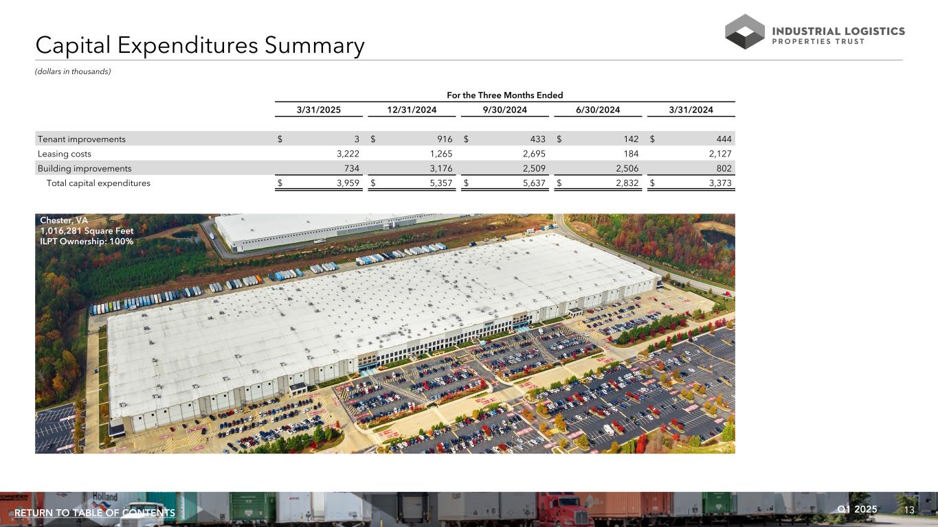 13Q1 2025RETURN TO TABLE OF CONTENTS (dollars in thousands) For the Three Months Ended 3/31/2025 12/31/2024 9/30/2024 6/30/2024 3/31/2024 Tenant improvements $ 3 $ 916 $ 433 $ 142 $ 444 Leasing costs 3,222 1,265 2,695 184 2,127 Building improvements 734 3,176 2,509 2,506 802 Total capital expenditures $ 3,959 $ 5,357 $ 5,637 $ 2,832 $ 3,373 Capital Expenditures Summary 2552 South 98th Street Edwardsville, KS 280,019 Square Feet ILPT Ownership: 61% TO BE UPDATED BY IR Chester, VA 1,016,281 Square Feet ILPT Ownership: 100%
