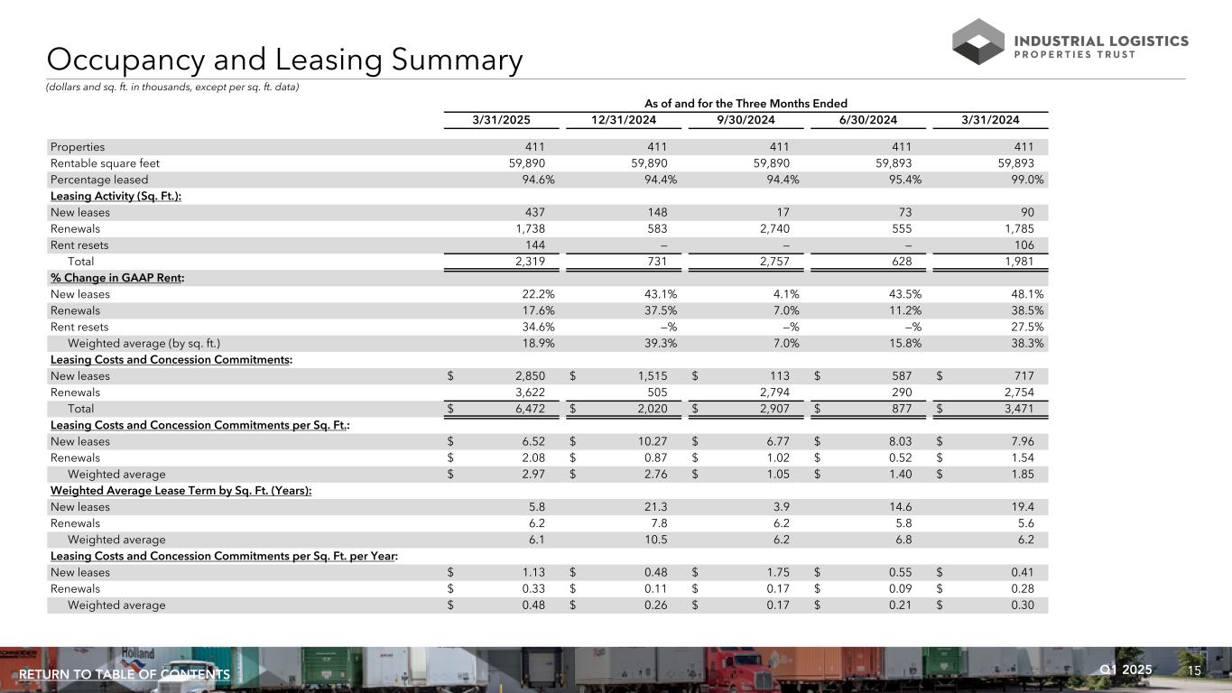 33Q1 2025RETURN TO TABLE OF CONTENTS Warning Concerning Forward-Looking Statements This presentation contains forward-looking statements within the meaning of the Private Securities Litigation Reform Act of 1995 and other securities laws that are subject to risks and uncertainties. These statements may include words such as “believe”, “expect”, “anticipate”, “intend”, “plan”, “estimate”, “will”, “may” and negatives or derivatives of these or similar expressions. These forward-looking statements include, among others, statements about: ILPT's operating fundamentals and leasing velocity; ILPT's ability to realize organic cash flow growth and maintain portfolio stability; tenant retention at and demand for ILPT's properties; debt maturities; ILPT's and/or Mountain JV's potential exercise of extension options for the maturity date of loans; and ILPT’s capital expenditure plans and commitments. Forward-looking statements reflect ILPT’s current expectations, are based on judgments and assumptions, are inherently uncertain and are subject to risks, uncertainties and other factors, which could cause ILPT’s actual results, performance or achievements to differ materially from expected future results, performance or achievements expressed or implied in those forward-looking statements. Some of the risks, uncertainties and other factors that may cause its actual results, performance or achievements to differ materially from those expressed or implied by forward-looking statements include, but are not limited to, the following: whether ILPT's tenants will renew or extend their leases or whether ILPT will obtain replacement tenants on terms as favorable to it as the terms of its existing leases; ILPT's ability to successfully compete for tenancies, the likelihood that the rents it realizes will increase when ILPT renews or extends its leases, enters new leases, or its rents reset at ILPT’s properties located in Hawaii; ILPT’s ability to maintain high occupancy at its properties; ILPT’s ability to reduce its leverage, generate cash flow and take advantage of mark-to-market leasing opportunities; ILPT's ability to cost-effectively raise and balance its use of debt or equity capital; ILPT’s ability to pay interest on and principal of its debt; ILPT’s ability to purchase cost effective interest rate caps; ILPT's expected capital expenditures and leasing costs; ILPT’s ability to maintain sufficient liquidity; demand for industrial and logistics properties; ILPT’s ability and the ability of its tenants to operate under unfavorable market and commercial real estate industry conditions, due to uncertainties surrounding interest rates and inflation, effect of or changes to tariffs or trading policies, supply chain disruptions, emerging technologies, volatility in the public equity and debt markets, pandemics, geopolitical instability and tensions, economic downturns or a possible recession, labor market conditions or changes in real estate utilization; whether the industrial and logistics sector and the extent to which ILPT's tenants' businesses are critical to sustaining a resilient supply chain and that ILPT's business will benefit as a result; ILPT’s tenants’ ability and willingness to pay their rent obligations to ILPT; the credit qualities of ILPT’s tenants; changes in the security of cash flows from ILPT’s properties; potential defaults of ILPT's leases by its tenants; ILPT's tenant and geographic concentrations; ILPT’s ability to pay distributions to its shareholders and to increase or sustain the amount of such distributions; ILPT’s ability to sell properties at prices or returns it targets, and the timing of such sales; ILPT's ability to complete sales without delay, or at all, pursuant to existing agreement terms; ILPT’s ability to prudently pursue, and successfully and profitably complete, expansion and renovation projects at its properties and to realize its expected returns on those projects; risks and uncertainties regarding the development, redevelopment or repositioning of ILPT’s properties, including as a result of inflation, cost overruns, tariffs, supply chain challenges, labor market conditions, construction delays or ILPT's inability to obtain necessary permits; ILPT’s ability to lease space at these properties at targeted returns and volatility in the commercial real estate markets; ILPT’s ability to sell additional equity interests in, or contribute additional properties to, its existing joint ventures, to enter into additional real estate joint ventures or to attract co-venturers and benefit from its existing joint ventures or any real estate joint ventures ILPT may enter into; non-performance by the counterparties to ILPT's interest rate caps; the ability of ILPT’s manager, RMR, to successfully manage it; changes in environmental laws or in their interpretations or enforcement as a result of climate change or otherwise, or ILPT’s incurring environmental remediation costs or other liabilities; competition within the commercial real estate industry, particularly for industrial and logistics properties in those markets in which ILPT’s properties are located; compliance with, and changes to, federal, state and local laws and regulations, accounting rules, tax laws and similar matters; limitations imposed by and ILPT’s ability to satisfy complex rules to maintain its qualification for taxation as a REIT for U.S. federal income tax purposes; actual and potential conflicts of interest with ILPT’s related parties, including its managing trustees, RMR and others affiliated with them; acts of terrorism, outbreaks of pandemics or other public health safety events or conditions, war or other hostilities, global climate change or other manmade or natural disasters beyond ILPT's control; and other matters. These risks, uncertainties and other factors are not exhaustive and should be read in conjunction with other caut
