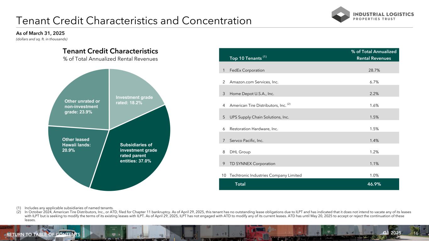 16Q1 2025RETURN TO TABLE OF CONTENTS As of March 31, 2025 Tenant Credit Characteristics and Concentration % of Total Annualized Top 10 Tenants (1) Rental Revenues 1 FedEx Corporation 28.7% 2 Amazon.com Services, Inc. 6.7% 3 Home Depot U.S.A., Inc. 2.2% 4 American Tire Distributors, Inc. (2) 1.6% 5 UPS Supply Chain Solutions, Inc. 1.5% 6 Restoration Hardware, Inc. 1.5% 7 Servco Pacific, Inc. 1.4% 8 DHL Group 1.2% 9 TD SYNNEX Corporation 1.1% 10 Techtronic Industries Company Limited 1.0% Total 46.9% (dollars and sq. ft. in thousands) Investment grade rated: 18.2% Subsidiaries of investment grade rated parent entities: 37.0% Other leased Hawaii lands: 20.9% Other unrated or non-investment grade: 23.9% Tenant Credit Characteristics % of Total Annualized Rental Revenues (1) Includes any applicable subsidiaries of named tenants. (2) In October 2024, American Tire Distributors, Inc., or ATD, filed for Chapter 11 bankruptcy. As of April 29, 2025, this tenant has no outstanding lease obligations due to ILPT and has indicated that it does not intend to vacate any of its leases with ILPT but is seeking to modify the terms of its existing leases with ILPT. As of April 29, 2025, ILPT has not engaged with ATD to modify any of its current leases. ATD has until May 20, 2025 to accept or reject the continuation of these leases.