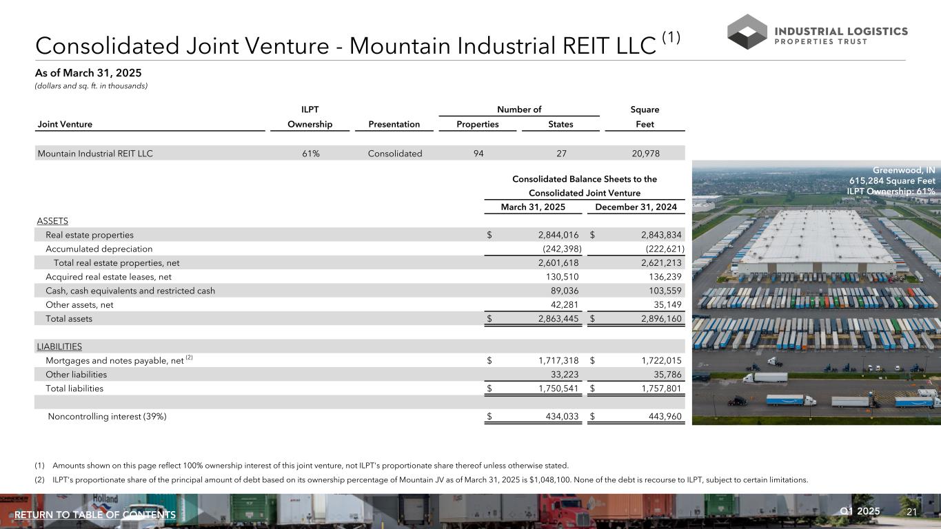 21Q1 2025RETURN TO TABLE OF CONTENTS (dollars and sq. ft. in thousands) ILPT Number of Square Joint Venture Ownership Presentation Properties States Feet Mountain Industrial REIT LLC 61% Consolidated 94 27 20,978 (1) Amounts shown on this page reflect 100% ownership interest of this joint venture, not ILPT's proportionate share thereof unless otherwise stated. (2) ILPT's proportionate share of the principal amount of debt based on its ownership percentage of Mountain JV as of March 31, 2025 is $1,048,100. None of the debt is recourse to ILPT, subject to certain limitations. As of March 31, 2025 Consolidated Balance Sheets to the Consolidated Joint Venture March 31, 2025 December 31, 2024 ASSETS Real estate properties $ 2,844,016 $ 2,843,834 Accumulated depreciation (242,398) (222,621) Total real estate properties, net 2,601,618 2,621,213 Acquired real estate leases, net 130,510 136,239 Cash, cash equivalents and restricted cash 89,036 103,559 Other assets, net 42,281 35,149 Total assets $ 2,863,445 $ 2,896,160 LIABILITIES Mortgages and notes payable, net (2) $ 1,717,318 $ 1,722,015 Other liabilities 33,223 35,786 Total liabilities $ 1,750,541 $ 1,757,801 Noncontrolling interest (39%) $ 434,033 $ 443,960 Consolidated Joint Venture - Mountain Industrial REIT LLC (1) Greenwood, IN 615,284 Square Feet ILPT Ownership: 61%
