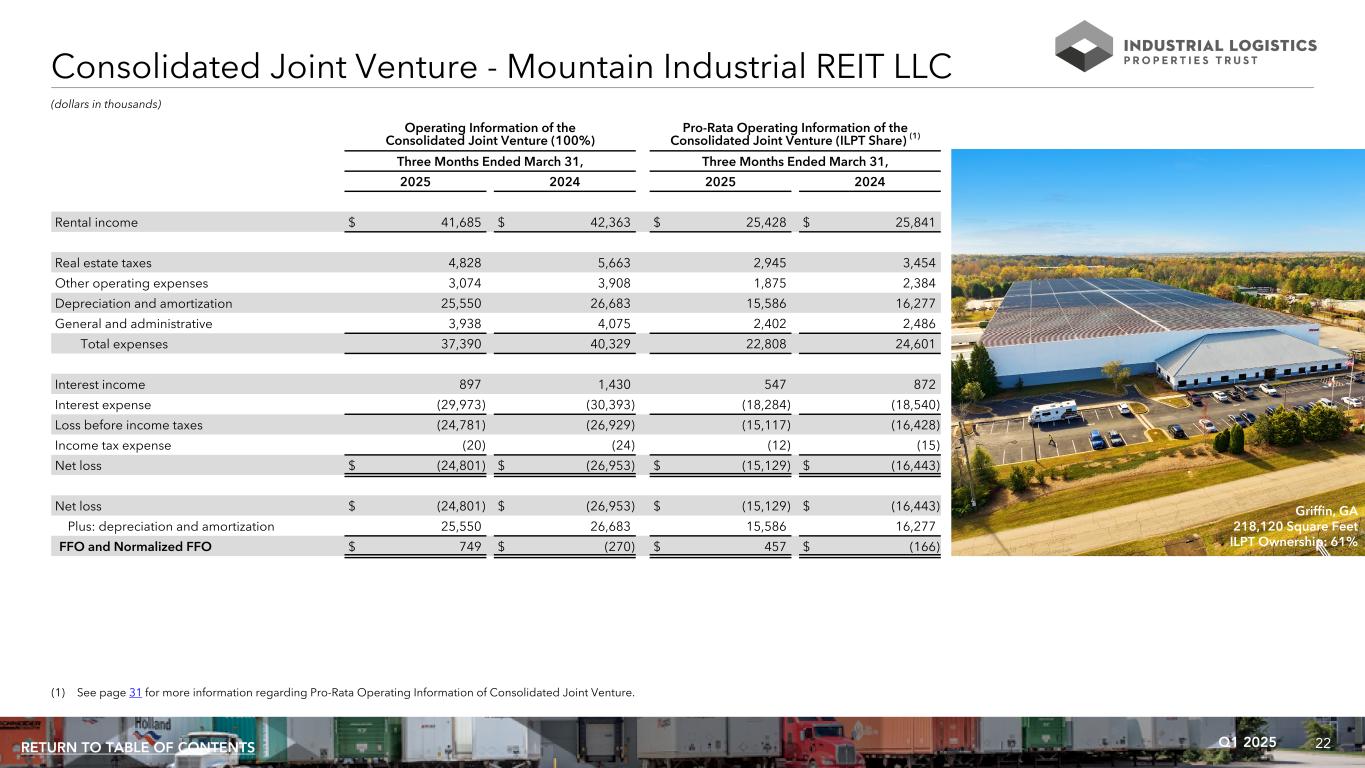 22Q1 2025RETURN TO TABLE OF CONTENTS Operating Information of the Consolidated Joint Venture (100%) Pro-Rata Operating Information of the Consolidated Joint Venture (ILPT Share) (1) Three Months Ended March 31, Three Months Ended March 31, 2025 2024 2025 2024 Rental income $ 41,685 $ 42,363 $ 25,428 $ 25,841 Real estate taxes 4,828 5,663 2,945 3,454 Other operating expenses 3,074 3,908 1,875 2,384 Depreciation and amortization 25,550 26,683 15,586 16,277 General and administrative 3,938 4,075 2,402 2,486 Total expenses 37,390 40,329 22,808 24,601 Interest income 897 1,430 547 872 Interest expense (29,973) (30,393) (18,284) (18,540) Loss before income taxes (24,781) (26,929) (15,117) (16,428) Income tax expense (20) (24) (12) (15) Net loss $ (24,801) $ (26,953) $ (15,129) $ (16,443) Net loss $ (24,801) $ (26,953) $ (15,129) $ (16,443) Plus: depreciation and amortization 25,550 26,683 15,586 16,277 FFO and Normalized FFO $ 749 $ (270) $ 457 $ (166) (dollars in thousands) (1) See page 31 for more information regarding Pro-Rata Operating Information of Consolidated Joint Venture. Consolidated Joint Venture - Mountain Industrial REIT LLC Griffin, GA 218,120 Square Feet ILPT Ownership: 61%