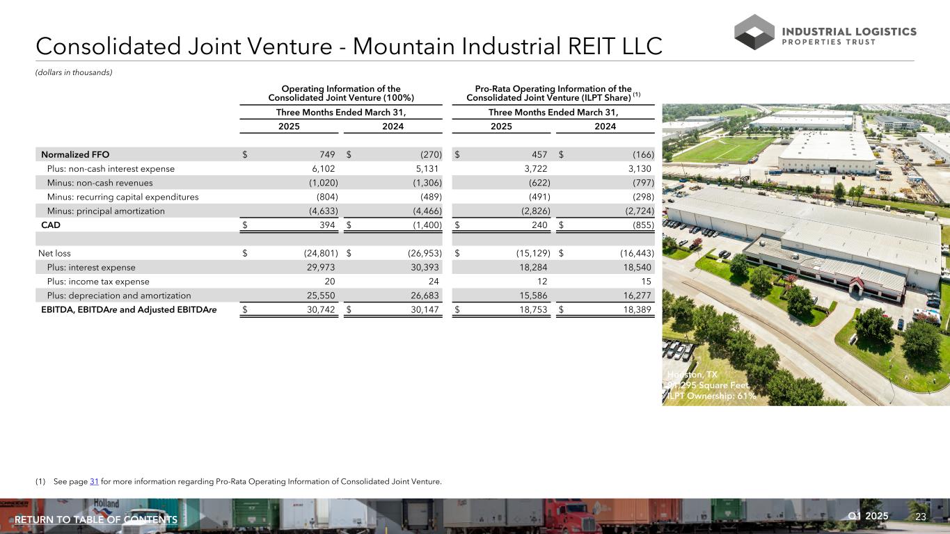 23Q1 2025RETURN TO TABLE OF CONTENTS Operating Information of the Consolidated Joint Venture (100%) Pro-Rata Operating Information of the Consolidated Joint Venture (ILPT Share) (1) Three Months Ended March 31, Three Months Ended March 31, 2025 2024 2025 2024 Normalized FFO $ 749 $ (270) $ 457 $ (166) Plus: non-cash interest expense 6,102 5,131 3,722 3,130 Minus: non-cash revenues (1,020) (1,306) (622) (797) Minus: recurring capital expenditures (804) (489) (491) (298) Minus: principal amortization (4,633) (4,466) (2,826) (2,724) CAD $ 394 $ (1,400) $ 240 $ (855) Net loss $ (24,801) $ (26,953) $ (15,129) $ (16,443) Plus: interest expense 29,973 30,393 18,284 18,540 Plus: income tax expense 20 24 12 15 Plus: depreciation and amortization 25,550 26,683 15,586 16,277 EBITDA, EBITDAre and Adjusted EBITDAre $ 30,742 $ 30,147 $ 18,753 $ 18,389 (dollars in thousands) Consolidated Joint Venture - Mountain Industrial REIT LLC (1) See page 31 for more information regarding Pro-Rata Operating Information of Consolidated Joint Venture. Houston, TX 91,295 Square Feet ILPT Ownership: 61%