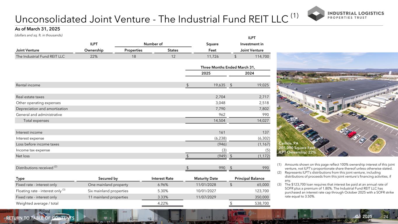 24Q1 2025RETURN TO TABLE OF CONTENTS Unconsolidated Joint Venture - The Industrial Fund REIT LLC (1) As of March 31, 2025 ILPT ILPT Number of Square Investment in Joint Venture Ownership Properties States Feet Joint Venture The Industrial Fund REIT LLC 22% 18 12 11,726 $ 114,700 Three Months Ended March 31, 2025 2024 Rental income $ 19,635 $ 19,025 Real estate taxes 2,704 2,717 Other operating expenses 3,048 2,518 Depreciation and amortization 7,790 7,802 General and administrative 962 990 Total expenses 14,504 14,027 Interest income 161 137 Interest expense (6,238) (6,302) Loss before income taxes (946) (1,167) Income tax expense (3) (5) Net loss $ (949) $ (1,172) Distributions received (2) $ 990 $ 990 Type Secured by Interest Rate Maturity Date Principal Balance Fixed rate - interest only One mainland property 6.96% 11/01/2028 $ 65,000 Floating rate - interest only (3) Six mainland properties 5.30% 10/01/2027 123,700 Fixed rate - interest only 11 mainland properties 3.33% 11/07/2029 350,000 Weighted average / total 4.22% $ 538,700 (1) Amounts shown on this page reflect 100% ownership interest of this joint venture, not ILPT's proportionate share thereof unless otherwise stated. (2) Represents ILPT's distributions from this joint venture, including distributions of proceeds from this joint venture's financing activities, if any. (3) The $123,700 loan requires that interest be paid at an annual rate of SOFR plus a premium of 1.80%. The Industrial Fund REIT LLC has purchased an interest rate cap through October 2025 with a SOFR strike rate equal to 3.50%. (dollars and sq. ft. in thousands) Carlisle, PA 205,090 Square Feet ILPT Ownership: 22%