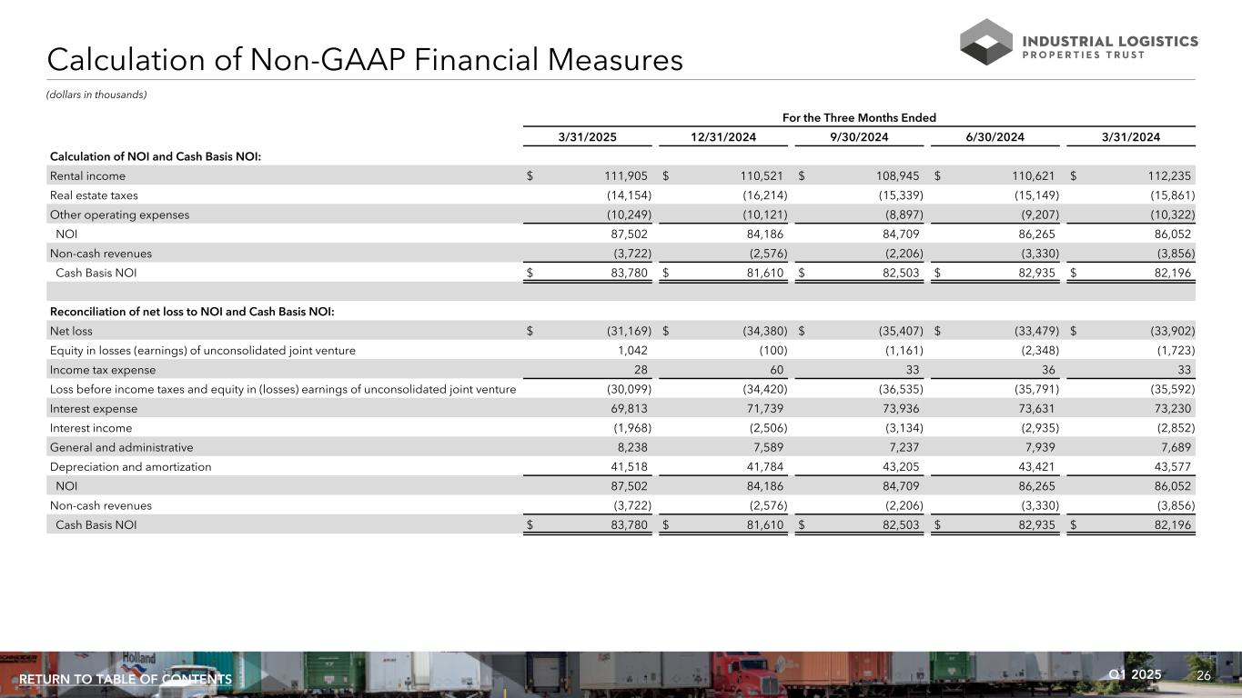 26Q1 2025RETURN TO TABLE OF CONTENTS (dollars in thousands) For the Three Months Ended 3/31/2025 12/31/2024 9/30/2024 6/30/2024 3/31/2024 Calculation of NOI and Cash Basis NOI: Rental income $ 111,905 $ 110,521 $ 108,945 $ 110,621 $ 112,235 Real estate taxes (14,154) (16,214) (15,339) (15,149) (15,861) Other operating expenses (10,249) (10,121) (8,897) (9,207) (10,322) NOI 87,502 84,186 84,709 86,265 86,052 Non-cash revenues (3,722) (2,576) (2,206) (3,330) (3,856) Cash Basis NOI $ 83,780 $ 81,610 $ 82,503 $ 82,935 $ 82,196 Reconciliation of net loss to NOI and Cash Basis NOI: Net loss $ (31,169) $ (34,380) $ (35,407) $ (33,479) $ (33,902) Equity in losses (earnings) of unconsolidated joint venture 1,042 (100) (1,161) (2,348) (1,723) Income tax expense 28 60 33 36 33 Loss before income taxes and equity in (losses) earnings of unconsolidated joint venture (30,099) (34,420) (36,535) (35,791) (35,592) Interest expense 69,813 71,739 73,936 73,631 73,230 Interest income (1,968) (2,506) (3,134) (2,935) (2,852) General and administrative 8,238 7,589 7,237 7,939 7,689 Depreciation and amortization 41,518 41,784 43,205 43,421 43,577 NOI 87,502 84,186 84,709 86,265 86,052 Non-cash revenues (3,722) (2,576) (2,206) (3,330) (3,856) Cash Basis NOI $ 83,780 $ 81,610 $ 82,503 $ 82,935 $ 82,196 Calculation of Non-GAAP Financial Measures