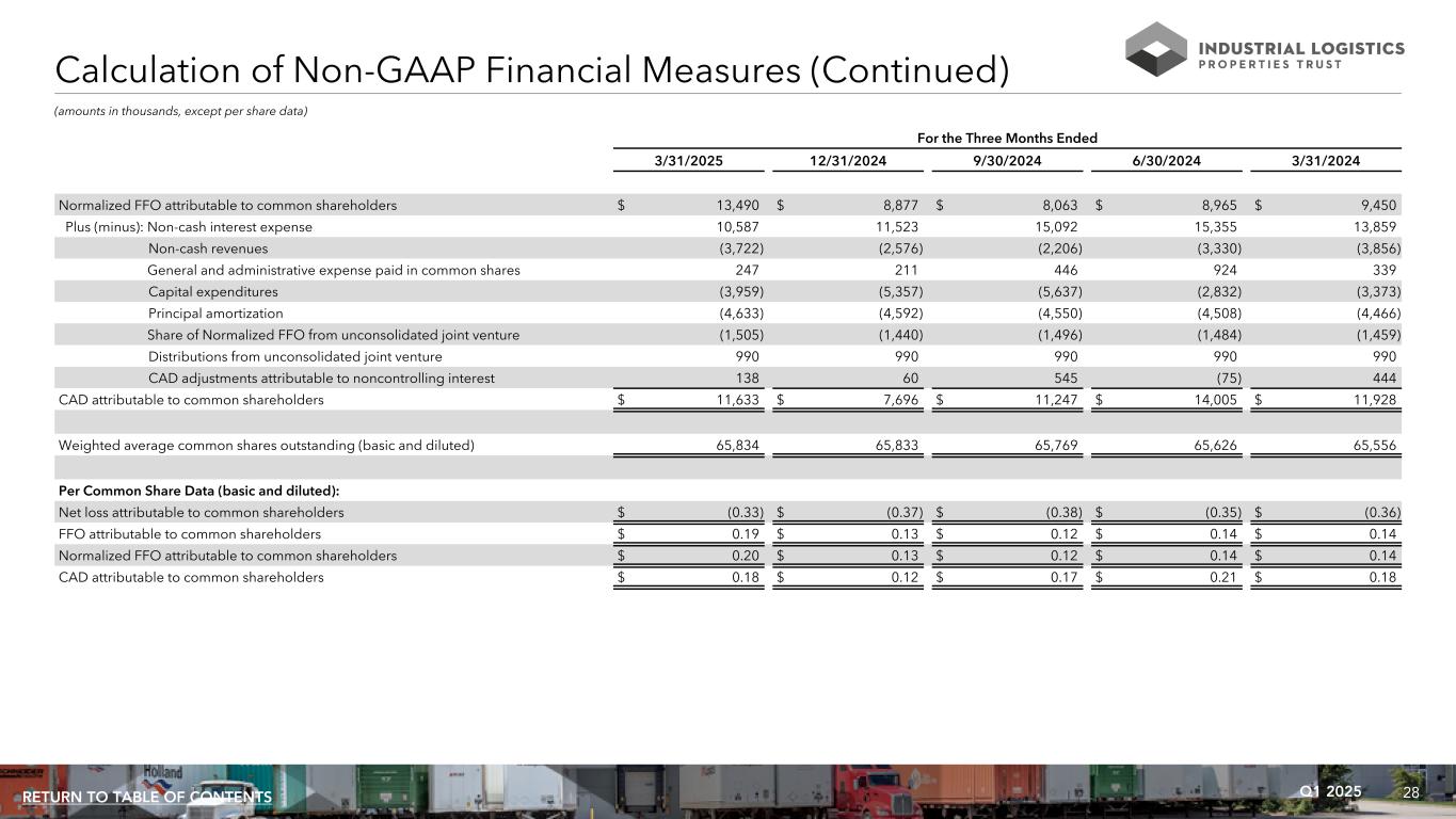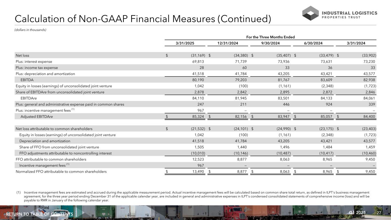 27Q1 2025RETURN TO TABLE OF CONTENTS (dollars in thousands) For the Three Months Ended 3/31/2025 12/31/2024 9/30/2024 6/30/2024 3/31/2024 Net loss $ (31,169) $ (34,380) $ (35,407) $ (33,479) $ (33,902) Plus: interest expense 69,813 71,739 73,936 73,631 73,230 Plus: income tax expense 28 60 33 36 33 Plus: depreciation and amortization 41,518 41,784 43,205 43,421 43,577 EBITDA 80,190 79,203 81,767 83,609 82,938 Equity in losses (earnings) of unconsolidated joint venture 1,042 (100) (1,161) (2,348) (1,723) Share of EBITDAre from unconsolidated joint venture 2,878 2,842 2,895 2,872 2,846 EBITDAre 84,110 81,945 83,501 84,133 84,061 Plus: general and administrative expense paid in common shares 247 211 446 924 339 Plus: incentive management fees (1) 967 — — — — Adjusted EBITDAre $ 85,324 $ 82,156 $ 83,947 $ 85,057 $ 84,400 Net loss attributable to common shareholders $ (21,532) $ (24,101) $ (24,990) $ (23,175) $ (23,403) Equity in losses (earnings) of unconsolidated joint venture 1,042 (100) (1,161) (2,348) (1,723) Depreciation and amortization 41,518 41,784 43,205 43,421 43,577 Share of FFO from unconsolidated joint venture 1,505 1,440 1,496 1,484 1,459 FFO adjustments attributable to noncontrolling interest (10,010) (10,146) (10,487) (10,417) (10,460) FFO attributable to common shareholders 12,523 8,877 8,063 8,965 9,450 Incentive management fees (1) 967 — — — — Normalized FFO attributable to common shareholders $ 13,490 $ 8,877 $ 8,063 $ 8,965 $ 9,450 (1) Incentive management fees are estimated and accrued during the applicable measurement period. Actual incentive management fees will be calculated based on common share total return, as defined in ILPT's business management agreement, for the three year period ending December 31 of the applicable calendar year, are included in general and administrative expenses in ILPT's condensed consolidated statements of comprehensive income (loss) and will be payable to RMR in January of the following calendar year. Calculation of Non-GAAP Financial Measures (Continued)