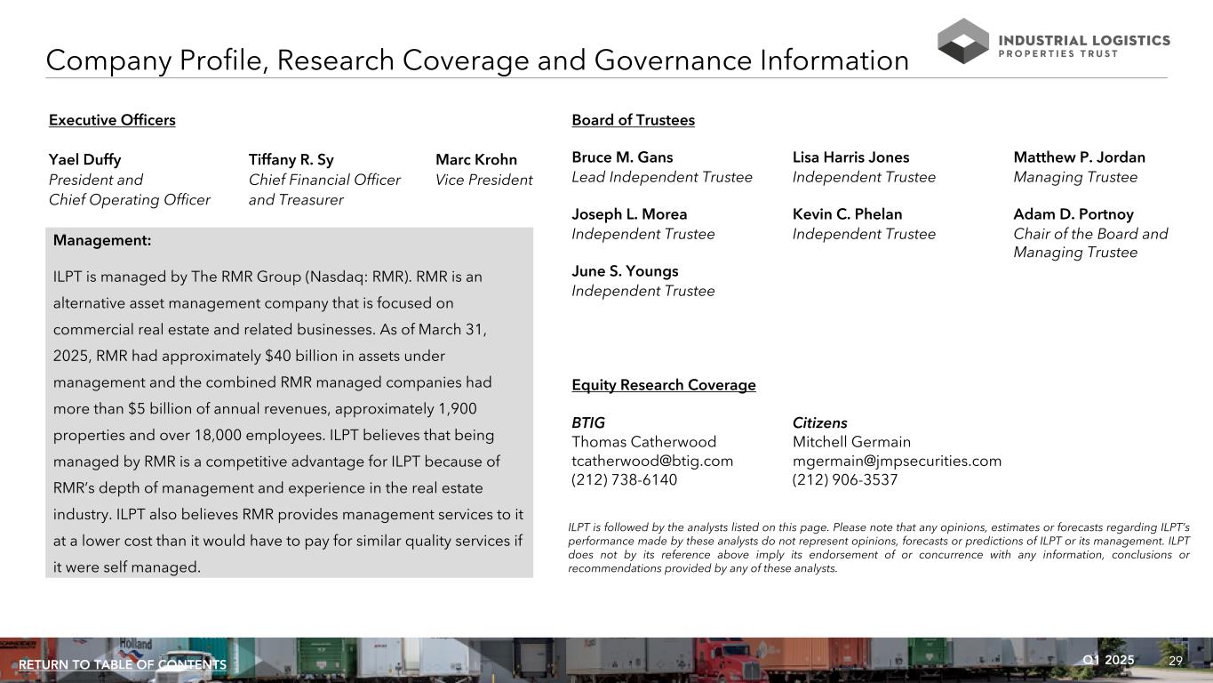 29Q1 2025RETURN TO TABLE OF CONTENTS Company Profile, Research Coverage and Governance Information Management: ILPT is managed by The RMR Group (Nasdaq: RMR). RMR is an alternative asset management company that is focused on commercial real estate and related businesses. As of March 31, 2025, RMR had approximately $40 billion in assets under management and the combined RMR managed companies had more than $5 billion of annual revenues, approximately 1,900 properties and over 18,000 employees. ILPT believes that being managed by RMR is a competitive advantage for ILPT because of RMR’s depth of management and experience in the real estate industry. ILPT also believes RMR provides management services to it at a lower cost than it would have to pay for similar quality services if it were self managed. Board of Trustees Bruce M. Gans Lisa Harris Jones Matthew P. Jordan Lead Independent Trustee Independent Trustee Managing Trustee Joseph L. Morea Kevin C. Phelan Adam D. Portnoy Independent Trustee Independent Trustee Chair of the Board and Managing Trustee June S. Youngs Independent Trustee Equity Research Coverage BTIG Citizens Thomas Catherwood Mitchell Germain tcatherwood@btig.com mgermain@jmpsecurities.com (212) 738-6140 (212) 906-3537 ILPT is followed by the analysts listed on this page. Please note that any opinions, estimates or forecasts regarding ILPT’s performance made by these analysts do not represent opinions, forecasts or predictions of ILPT or its management. ILPT does not by its reference above imply its endorsement of or concurrence with any information, conclusions or recommendations provided by any of these analysts. Executive Officers Yael Duffy Tiffany R. Sy Marc Krohn President and Chief Financial Officer Vice President Chief Operating Officer and Treasurer