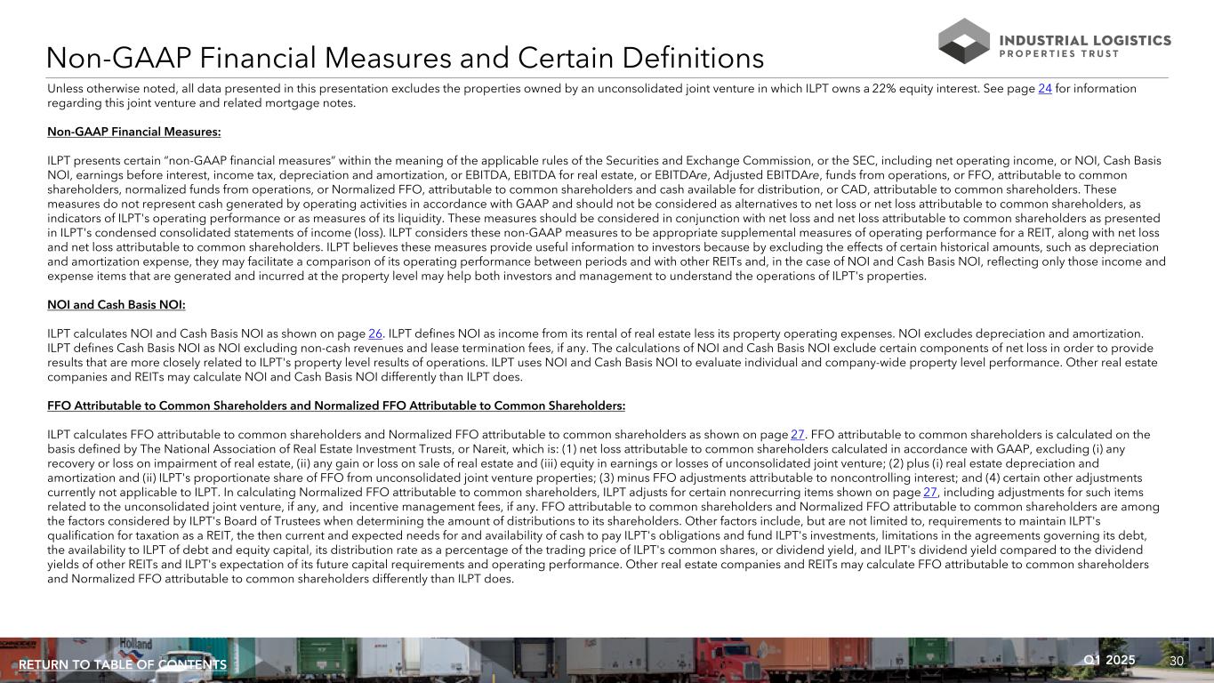 30Q1 2025RETURN TO TABLE OF CONTENTS Unless otherwise noted, all data presented in this presentation excludes the properties owned by an unconsolidated joint venture in which ILPT owns a 22% equity interest. See page 24 for information regarding this joint venture and related mortgage notes. Non-GAAP Financial Measures: ILPT presents certain “non-GAAP financial measures” within the meaning of the applicable rules of the Securities and Exchange Commission, or the SEC, including net operating income, or NOI, Cash Basis NOI, earnings before interest, income tax, depreciation and amortization, or EBITDA, EBITDA for real estate, or EBITDAre, Adjusted EBITDAre, funds from operations, or FFO, attributable to common shareholders, normalized funds from operations, or Normalized FFO, attributable to common shareholders and cash available for distribution, or CAD, attributable to common shareholders. These measures do not represent cash generated by operating activities in accordance with GAAP and should not be considered as alternatives to net loss or net loss attributable to common shareholders, as indicators of ILPT's operating performance or as measures of its liquidity. These measures should be considered in conjunction with net loss and net loss attributable to common shareholders as presented in ILPT's condensed consolidated statements of income (loss). ILPT considers these non-GAAP measures to be appropriate supplemental measures of operating performance for a REIT, along with net loss and net loss attributable to common shareholders. ILPT believes these measures provide useful information to investors because by excluding the effects of certain historical amounts, such as depreciation and amortization expense, they may facilitate a comparison of its operating performance between periods and with other REITs and, in the case of NOI and Cash Basis NOI, reflecting only those income and expense items that are generated and incurred at the property level may help both investors and management to understand the operations of ILPT's properties. NOI and Cash Basis NOI: ILPT calculates NOI and Cash Basis NOI as shown on page 26. ILPT defines NOI as income from its rental of real estate less its property operating expenses. NOI excludes depreciation and amortization. ILPT defines Cash Basis NOI as NOI excluding non-cash revenues and lease termination fees, if any. The calculations of NOI and Cash Basis NOI exclude certain components of net loss in order to provide results that are more closely related to ILPT's property level results of operations. ILPT uses NOI and Cash Basis NOI to evaluate individual and company-wide property level performance. Other real estate companies and REITs may calculate NOI and Cash Basis NOI differently than ILPT does. FFO Attributable to Common Shareholders and Normalized FFO Attributable to Common Shareholders: ILPT calculates FFO attributable to common shareholders and Normalized FFO attributable to common shareholders as shown on page 27. FFO attributable to common shareholders is calculated on the basis defined by The National Association of Real Estate Investment Trusts, or Nareit, which is: (1) net loss attributable to common shareholders calculated in accordance with GAAP, excluding (i) any recovery or loss on impairment of real estate, (ii) any gain or loss on sale of real estate and (iii) equity in earnings or losses of unconsolidated joint venture; (2) plus (i) real estate depreciation and amortization and (ii) ILPT's proportionate share of FFO from unconsolidated joint venture properties; (3) minus FFO adjustments attributable to noncontrolling interest; and (4) certain other adjustments currently not applicable to ILPT. In calculating Normalized FFO attributable to common shareholders, ILPT adjusts for certain nonrecurring items shown on page 27, including adjustments for such items related to the unconsolidated joint venture, if any, and incentive management fees, if any. FFO attributable to common shareholders and Normalized FFO attributable to common shareholders are among the factors considered by ILPT's Board of Trustees when determining the amount of distributions to its shareholders. Other factors include, but are not limited to, requirements to maintain ILPT's qualification for taxation as a REIT, the then current and expected needs for and availability of cash to pay ILPT's obligations and fund ILPT's investments, limitations in the agreements governing its debt, the availability to ILPT of debt and equity capital, its distribution rate as a percentage of the trading price of ILPT's common shares, or dividend yield, and ILPT's dividend yield compared to the dividend yields of other REITs and ILPT's expectation of its future capital requirements and operating performance. Other real estate companies and REITs may calculate FFO attributable to common shareholders and Normalized FFO attributable to common shareholders differently than ILPT does. Non-GAAP Financial Measures and Certain Definitions