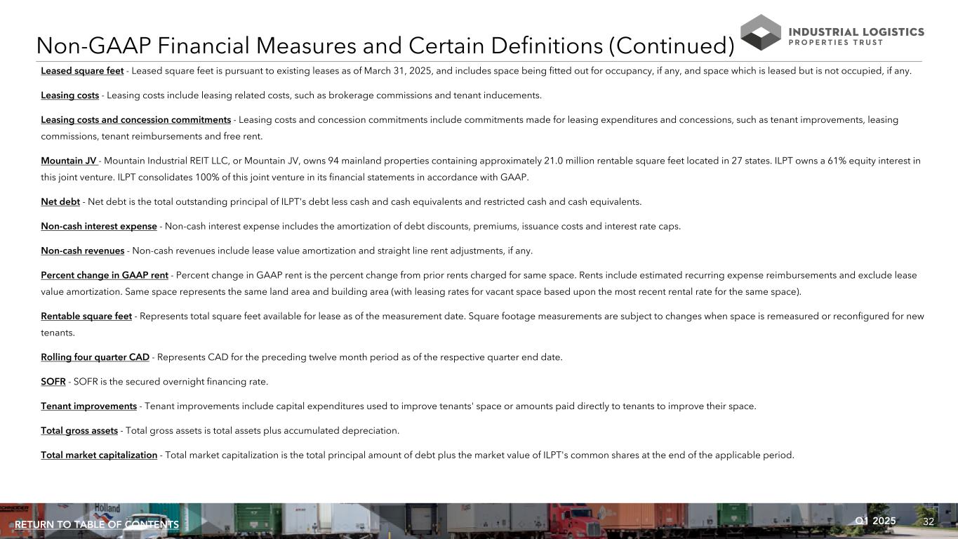 32Q1 2025RETURN TO TABLE OF CONTENTS Leased square feet - Leased square feet is pursuant to existing leases as of March 31, 2025, and includes space being fitted out for occupancy, if any, and space which is leased but is not occupied, if any. Leasing costs - Leasing costs include leasing related costs, such as brokerage commissions and tenant inducements. Leasing costs and concession commitments - Leasing costs and concession commitments include commitments made for leasing expenditures and concessions, such as tenant improvements, leasing commissions, tenant reimbursements and free rent. Mountain JV - Mountain Industrial REIT LLC, or Mountain JV, owns 94 mainland properties containing approximately 21.0 million rentable square feet located in 27 states. ILPT owns a 61% equity interest in this joint venture. ILPT consolidates 100% of this joint venture in its financial statements in accordance with GAAP. Net debt - Net debt is the total outstanding principal of ILPT's debt less cash and cash equivalents and restricted cash and cash equivalents. Non-cash interest expense - Non-cash interest expense includes the amortization of debt discounts, premiums, issuance costs and interest rate caps. Non-cash revenues - Non-cash revenues include lease value amortization and straight line rent adjustments, if any. Percent change in GAAP rent - Percent change in GAAP rent is the percent change from prior rents charged for same space. Rents include estimated recurring expense reimbursements and exclude lease value amortization. Same space represents the same land area and building area (with leasing rates for vacant space based upon the most recent rental rate for the same space). Rentable square feet - Represents total square feet available for lease as of the measurement date. Square footage measurements are subject to changes when space is remeasured or reconfigured for new tenants. Rolling four quarter CAD - Represents CAD for the preceding twelve month period as of the respective quarter end date. SOFR - SOFR is the secured overnight financing rate. Tenant improvements - Tenant improvements include capital expenditures used to improve tenants' space or amounts paid directly to tenants to improve their space. Total gross assets - Total gross assets is total assets plus accumulated depreciation. Total market capitalization - Total market capitalization is the total principal amount of debt plus the market value of ILPT's common shares at the end of the applicable period. Non-GAAP Financial Measures and Certain Definitions (Continued)