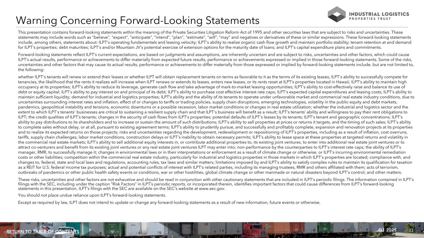 33Q1 2025RETURN TO TABLE OF CONTENTS Warning Concerning Forward-Looking Statements This presentation contains forward-looking statements within the meaning of the Private Securities Litigation Reform Act of 1995 and other securities laws that are subject to risks and uncertainties. These statements may include words such as “believe”, “expect”, “anticipate”, “intend”, “plan”, “estimate”, “will”, “may” and negatives or derivatives of these or similar expressions. These forward-looking statements include, among others, statements about: ILPT's operating fundamentals and leasing velocity; ILPT's ability to realize organic cash flow growth and maintain portfolio stability; tenant retention at and demand for ILPT's properties; debt maturities; ILPT's and/or Mountain JV's potential exercise of extension options for the maturity date of loans; and ILPT’s capital expenditure plans and commitments. Forward-looking statements reflect ILPT’s current expectations, are based on judgments and assumptions, are inherently uncertain and are subject to risks, uncertainties and other factors, which could cause ILPT’s actual results, performance or achievements to differ materially from expected future results, performance or achievements expressed or implied in those forward-looking statements. Some of the risks, uncertainties and other factors that may cause its actual results, performance or achievements to differ materially from those expressed or implied by forward-looking statements include, but are not limited to, the following: whether ILPT's tenants will renew or extend their leases or whether ILPT will obtain replacement tenants on terms as favorable to it as the terms of its existing leases; ILPT's ability to successfully compete for tenancies, the likelihood that the rents it realizes will increase when ILPT renews or extends its leases, enters new leases, or its rents reset at ILPT’s properties located in Hawaii; ILPT’s ability to maintain high occupancy at its properties; ILPT’s ability to reduce its leverage, generate cash flow and take advantage of mark-to-market leasing opportunities; ILPT's ability to cost-effectively raise and balance its use of debt or equity capital; ILPT’s ability to pay interest on and principal of its debt; ILPT’s ability to purchase cost effective interest rate caps; ILPT's expected capital expenditures and leasing costs; ILPT’s ability to maintain sufficient liquidity; demand for industrial and logistics properties; ILPT’s ability and the ability of its tenants to operate under unfavorable market and commercial real estate industry conditions, due to uncertainties surrounding interest rates and inflation, effect of or changes to tariffs or trading policies, supply chain disruptions, emerging technologies, volatility in the public equity and debt markets, pandemics, geopolitical instability and tensions, economic downturns or a possible recession, labor market conditions or changes in real estate utilization; whether the industrial and logistics sector and the extent to which ILPT's tenants' businesses are critical to sustaining a resilient supply chain and that ILPT's business will benefit as a result; ILPT’s tenants’ ability and willingness to pay their rent obligations to ILPT; the credit qualities of ILPT’s tenants; changes in the security of cash flows from ILPT’s properties; potential defaults of ILPT's leases by its tenants; ILPT's tenant and geographic concentrations; ILPT’s ability to pay distributions to its shareholders and to increase or sustain the amount of such distributions; ILPT’s ability to sell properties at prices or returns it targets, and the timing of such sales; ILPT's ability to complete sales without delay, or at all, pursuant to existing agreement terms; ILPT’s ability to prudently pursue, and successfully and profitably complete, expansion and renovation projects at its properties and to realize its expected returns on those projects; risks and uncertainties regarding the development, redevelopment or repositioning of ILPT’s properties, including as a result of inflation, cost overruns, tariffs, supply chain challenges, labor market conditions, construction delays or ILPT's inability to obtain necessary permits; ILPT’s ability to lease space at these properties at targeted returns and volatility in the commercial real estate markets; ILPT’s ability to sell additional equity interests in, or contribute additional properties to, its existing joint ventures, to enter into additional real estate joint ventures or to attract co-venturers and benefit from its existing joint ventures or any real estate joint ventures ILPT may enter into; non-performance by the counterparties to ILPT's interest rate caps; the ability of ILPT’s manager, RMR, to successfully manage it; changes in environmental laws or in their interpretations or enforcement as a result of climate change or otherwise, or ILPT’s incurring environmental remediation costs or other liabilities; competition within the commercial real estate industry, particularly for industrial and logistics properties in those markets in which ILPT’s properties are located; compliance with, and changes to, federal, state and local laws and regulations, accounting rules, tax laws and similar matters; limitations imposed by and ILPT’s ability to satisfy complex rules to maintain its qualification for taxation as a REIT for U.S. federal income tax purposes; actual and potential conflicts of interest with ILPT’s related parties, including its managing trustees, RMR and others affiliated with them; acts of terrorism, outbreaks of pandemics or other public health safety events or conditions, war or other hostilities, global climate change or other manmade or natural disasters beyond ILPT's control; and other matters. These risks, uncertainties and other factors are not exhaustive and should be read in conjunction with other caut