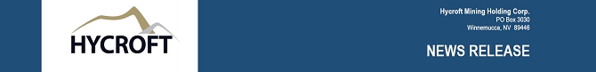 As previously reported, Hycroft initiated the largest exploration program at the Hycroft Mine in over a decade, which culminated in the best hole ever drilled in the history of Hycroft resulting in a very high-grade underground silver discovery. For more information please visit our website at www.hycroftmining.com.