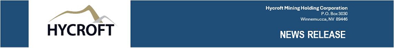 BMO Capital Markets is acting as the lead book-running manager with Paradigm Capital acting as book-running manager for the Offering. SCP Resource Finance LP is acting as a capital markets advisor to the Company. The Offering will be priced in the context of the market with the price, total size and other final terms of the Offering to be determined at the time of entering into an underwriting agreement for the Offering. Hycroft will also grant the underwriters a 30-day option to purchase up to an additional 15% of the base Offering. Closing of the offering will be subject to a number of customary conditions, including the entering into of a definitive underwriting agreement.