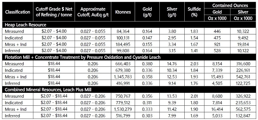 The growth in overall mineral resources and the establishment of the high-grade mineral resource with underground potential reflect a combination of improved metallurgical performance, results from 70 drill holes, geologic modeling based on new interpretations, and commodity price assumptions. The MRE is based on a flowsheet utilizing milling and pressure oxidation (“POX”) for sulfide and certain transition mineralization and heap leaching process for oxide and other transition mineralization.