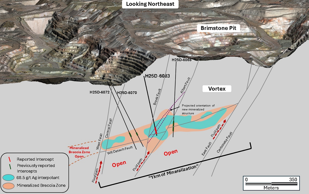 Diane Garrett, President and CEO commented: “These exceptional drill results represent a pivotal stage in the advancement of our project, where two years of disciplined analysis and exploration are delivering clear, high-impact success. They not only confirm the strength and continuity of the mineralization we’ve long believed in, but the consistency and scale of the mineralization we are seeing strongly support our geological and structural model. Results from both Vortex and Brimstone highlight two high-grade mineralized systems that are far more extensive than initially understood, with the true scope of each discovery beginning to emerge. More importantly, these results represent only a small portion of the system’s potential as both Vortex and Brimstone remain open in all directions and at depth. This is just the beginning of what we believe will be a much larger and highly compelling discovery story.”