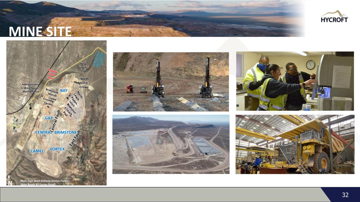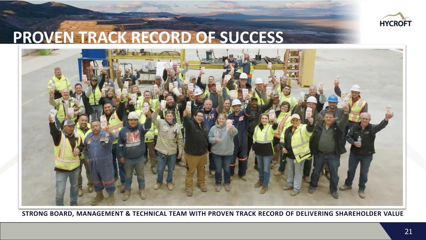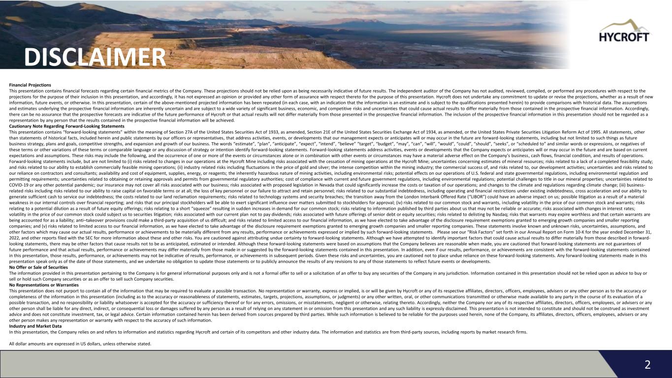 DISCLAIMER Financial Projections This presentation contains financial forecasts regarding certain financial metrics of the Company. These projections should not be relied upon as being necessarily indicative of future results. The independent auditor of the Company has not audited, reviewed, compiled, or performed any procedures with respect to the projections for the purpose of their inclusion in this presentation, and accordingly, it has not expressed an opinion or provided any other form of assurance with respect thereto for the purpose of this presentation. Hycroft does not undertake any commitment to update or revise the projections, whether as a result of new information, future events, or otherwise. In this presentation, certain of the above-mentioned projected information has been repeated (in each case, with an indication that the information is an estimate and is subject to the qualifications presented herein) to provide comparisons with historical data. The assumptions and estimates underlying the prospective financial information are inherently uncertain and are subject to a wide variety of significant business, economic, and competitive risks and uncertainties that could cause actual results to differ materially from those contained in the prospective financial information. Accordingly, there can be no assurance that the prospective forecasts are indicative of the future performance of Hycroft or that actual results will not differ materially from those presented in the prospective financial information. The inclusion of the prospective financial information in this presentation should not be regarded as a representation by any person that the results contained in the prospective financial information will be achieved. Cautionary Note Regarding Forward-Looking Statements This presentation contains “forward-looking statements” within the meaning of Section 27A of the United States Securities Act of 1933, as amended, Section 21E of the United States Securities Exchange Act of 1934, as amended, or the United States Private Securities Litigation Reform Act of 1995. All statements, other than statements of historical facts, included herein and public statements by our officers or representatives, that address activities, events, or developments that our management expects or anticipates will or may occur in the future are forward-looking statements, including but not limited to such things as future business strategy, plans and goals, competitive strengths, and expansion and growth of our business. The words “estimate”, “plan”, “anticipate”, “expect”, “intend”, “believe” “target”, “budget”, “may”, “can”, “will”, “would”, “could”, “should”, “seeks”, or “scheduled to” and similar words or expressions, or negatives of these terms or other variations of these terms or comparable language or any discussion of strategy or intention identify forward-looking statements. Forward-looking statements address activities, events or developments that the Company expects or anticipates will or may occur in the future and are based on current expectations and assumptions. These risks may include the following, and the occurrence of one or more of the events or circumstances alone or in combination with other events or circumstances may have a material adverse effect on the Company’s business, cash flows, financial condition, and results of operations. Forward-looking statements include, but are not limited to (i) risks related to changes in our operations at the Hycroft Mine including risks associated with the cessation of mining operations at the Hycroft Mine; uncertainties concerning estimates of mineral resources; risks related to a lack of a completed feasibility study; and risks related to our ability to establish commercially feasible mining operations; (ii) industry related risks including fluctuations in the price of gold and silver; the intense competition within the mining industry; the commercial success of, and risks related to, our development activities; uncertainties and risks related to our reliance on contractors and consultants; availability and cost of equipment, supplies, energy, or reagents; the inherently hazardous nature of mining activities, including environmental risks; potential effects on our operations of U.S. federal and state governmental regulations, including environmental regulation and permitting requirements; uncertainties related to obtaining or retaining approvals and permits from governmental regulatory authorities; cost of compliance with current and future government regulations, including environmental regulations; potential challenges to title in our mineral properties; uncertainties related to COVID-19 or any other potential pandemic; our insurance may not cover all risks associated with our business; risks associated with proposed legislation in Nevada that could significantly increase the costs or taxation of our operations; and changes to the climate and regulations regarding climate change; (iii) business- related risks including risks related to our ability to raise capital on favorable terms or at all; the loss of key personnel or our failure to attract and retain personnel; risks related to our substantial indebtedness, including operating and financial restrictions under existing indebtedness, cross acceleration and our ability to generate sufficient cash to service our indebtedness; the costs related to our land reclamation requirements; risks related to technology systems and security breaches; the transition away from the London Interbank Offered Rate (“LIBOR”) could have an adverse impact on us; possible litigation as a result of a material weakness in our internal controls over financial reporting; and risks that our principal stockholders will be able to exert significant influence over matters submitted to stockholders for approval; (iv) risks related to our common 