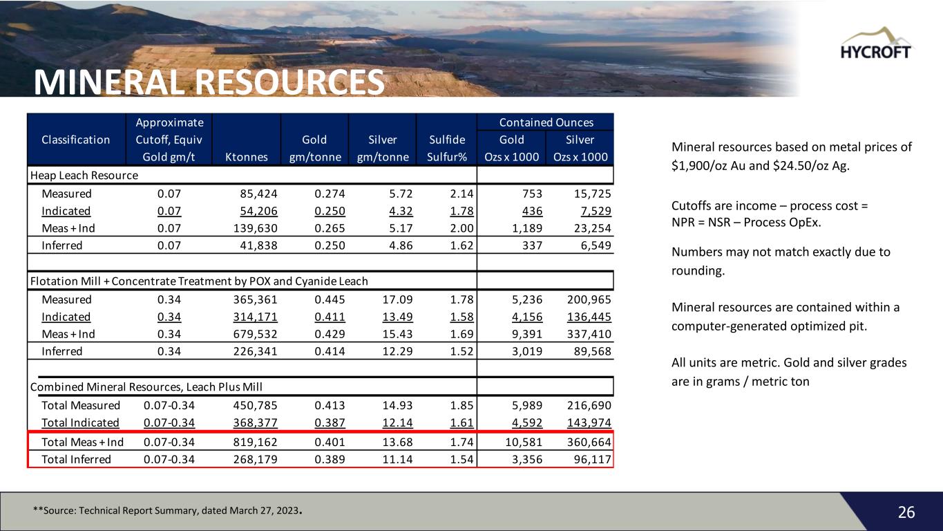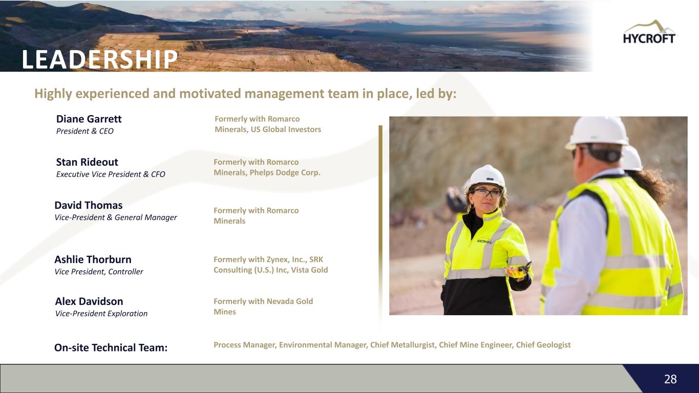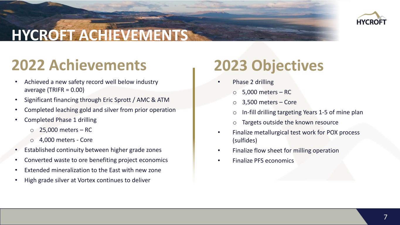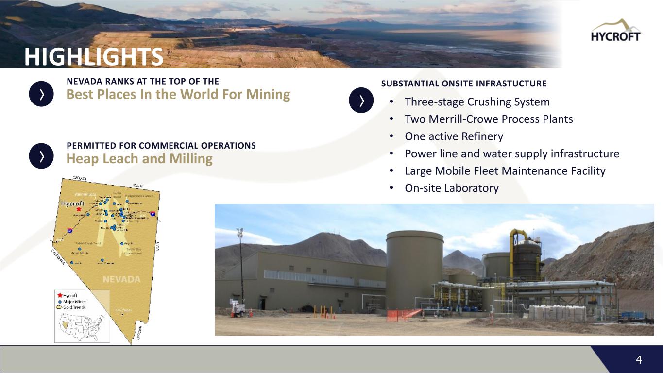 DISCLAIMER Financial Projections This presentation contains financial forecasts regarding certain financial metrics of the Company. These projections should not be relied upon as being necessarily indicative of future results. The independent auditor of the Company has not audited, reviewed, compiled, or performed any procedures with respect to the projections for the purpose of their inclusion in this presentation, and accordingly, it has not expressed an opinion or provided any other form of assurance with respect thereto for the purpose of this presentation. Hycroft does not undertake any commitment to update or revise the projections, whether as a result of new information, future events, or otherwise. In this presentation, certain of the above-mentioned projected information has been repeated (in each case, with an indication that the information is an estimate and is subject to the qualifications presented herein) to provide comparisons with historical data. The assumptions and estimates underlying the prospective financial information are inherently uncertain and are subject to a wide variety of significant business, economic, and competitive risks and uncertainties that could cause actual results to differ materially from those contained in the prospective financial information. Accordingly, there can be no assurance that the prospective forecasts are indicative of the future performance of Hycroft or that actual results will not differ materially from those presented in the prospective financial information. The inclusion of the prospective financial information in this presentation should not be regarded as a representation by any person that the results contained in the prospective financial information will be achieved. Cautionary Note Regarding Forward-Looking Statements This presentation contains “forward-looking statements” within the meaning of Section 27A of the United States Securities Act of 1933, as amended, Section 21E of the United States Securities Exchange Act of 1934, as amended, or the United States Private Securities Litigation Reform Act of 1995. All statements, other than statements of historical facts, included herein and public statements by our officers or representatives, that address activities, events, or developments that our management expects or anticipates will or may occur in the future are forward-looking statements, including but not limited to such things as future business strategy, plans and goals, competitive strengths, and expansion and growth of our business. The words “estimate”, “plan”, “anticipate”, “expect”, “intend”, “believe” “target”, “budget”, “may”, “can”, “will”, “would”, “could”, “should”, “seeks”, or “scheduled to” and similar words or expressions, or negatives of these terms or other variations of these terms or comparable language or any discussion of strategy or intention identify forward-looking statements. Forward-looking statements address activities, events or developments that the Company expects or anticipates will or may occur in the future and are based on current expectations and assumptions. These risks may include the following, and the occurrence of one or more of the events or circumstances alone or in combination with other events or circumstances may have a material adverse effect on the Company’s business, cash flows, financial condition, and results of operations. Forward-looking statements include, but are not limited to (i) risks related to changes in our operations at the Hycroft Mine including risks associated with the cessation of mining operations at the Hycroft Mine; uncertainties concerning estimates of mineral resources; risks related to a lack of a completed feasibility study; and risks related to our ability to establish commercially feasible mining operations; (ii) industry related risks including fluctuations in the price of gold and silver; the intense competition within the mining industry; the commercial success of, and risks related to, our development activities; uncertainties and risks related to our reliance on contractors and consultants; availability and cost of equipment, supplies, energy, or reagents; the inherently hazardous nature of mining activities, including environmental risks; potential effects on our operations of U.S. federal and state governmental regulations, including environmental regulation and permitting requirements; uncertainties related to obtaining or retaining approvals and permits from governmental regulatory authorities; cost of compliance with current and future government regulations, including environmental regulations; potential challenges to title in our mineral properties; uncertainties related to COVID-19 or any other potential pandemic; our insurance may not cover all risks associated with our business; risks associated with proposed legislation in Nevada that could significantly increase the costs or taxation of our operations; and changes to the climate and regulations regarding climate change; (iii) business- related risks including risks related to our ability to raise capital on favorable terms or at all; the loss of key personnel or our failure to attract and retain personnel; risks related to our substantial indebtedness, including operating and financial restrictions under existing indebtedness, cross acceleration and our ability to generate sufficient cash to service our indebtedness; the costs related to our land reclamation requirements; risks related to technology systems and security breaches; the transition away from the London Interbank Offered Rate (“LIBOR”) could have an adverse impact on us; possible litigation as a result of a material weakness in our internal controls over financial reporting; and risks that our principal stockholders will be able to exert significant influence over matters submitted to stockholders for approval; (iv) risks related to our common 
