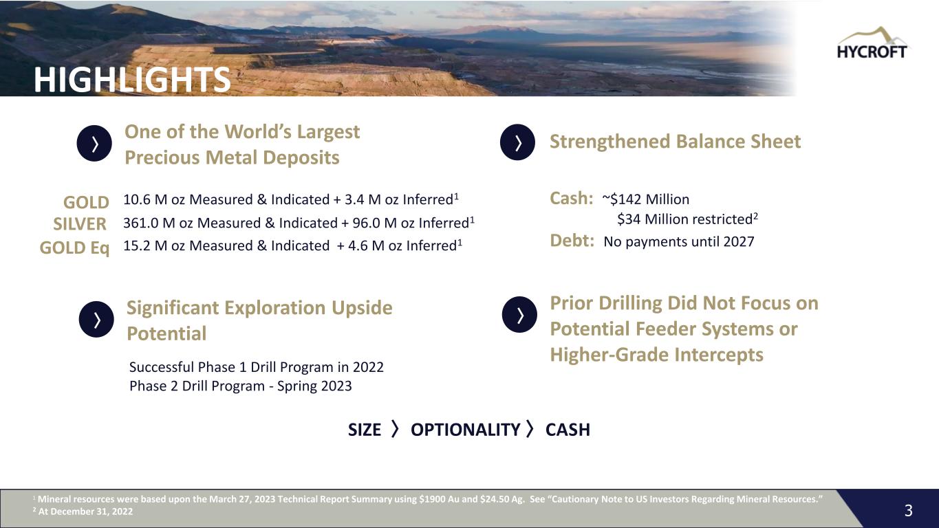 HIGHLIGHTS One of the World’s Largest Precious Metal Deposits GOLD 10.6 M oz Measured & Indicated + 3.4 M oz Inferred1 SILVER 361.0 M oz Measured & Indicated + 96.0 M oz Inferred1 GOLD Eq 15.2 M oz Measured & Indicated + 4.6 M oz Inferred1 Strengthened Balance Sheet Cash: ~$142 Million $34 Million restricted2 Debt: No payments until 2027 〉 〉 Significant Exploration Upside Potential 〉 Prior Drilling Did Not Focus on Potential Feeder Systems or Higher-Grade Intercepts 〉 SIZE 〉OPTIONALITY〉CASH 1 Mineral resources were based upon the March 27, 2023 Technical Report Summary using $1900 Au and $24.50 Ag. See “Cautionary Note to US Investors Regarding Mineral Resources.” 2 At December 31, 2022 3 Successful Phase 1 Drill Program in 2022 Phase 2 Drill Program - Spring 2023