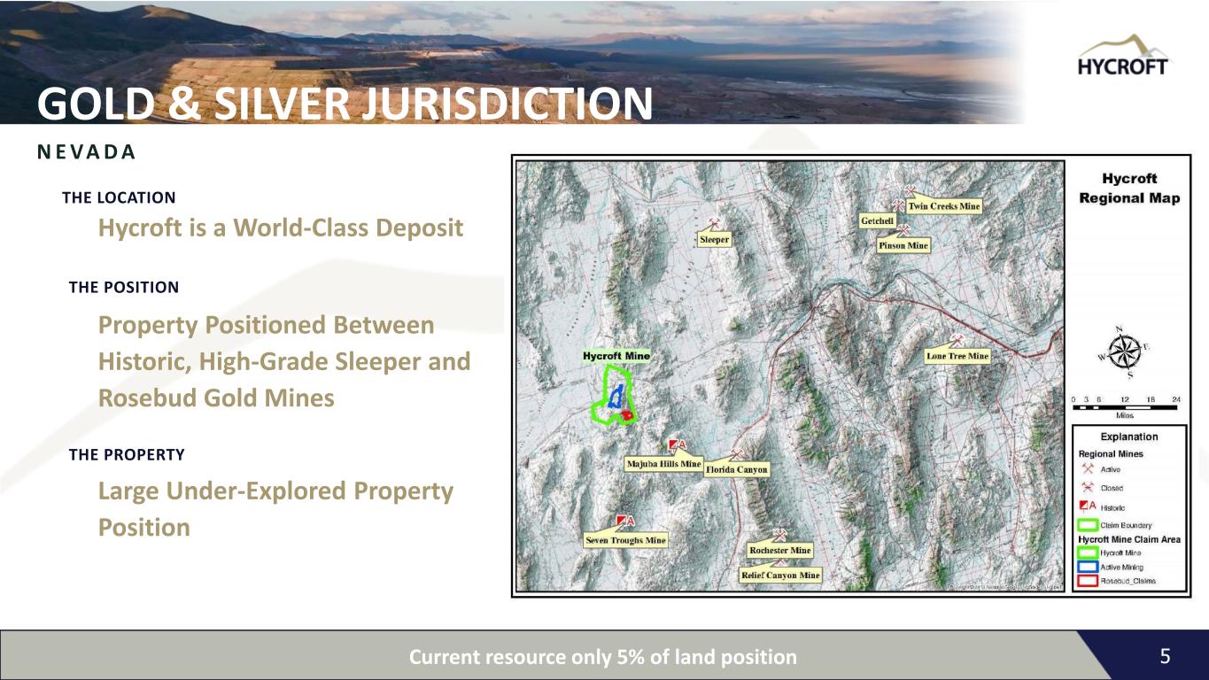 HIGHLIGHTS NEVADA RANKS AT THE TOP OF THE Best Places In the World For Mining PERMITTED FOR COMMERCIAL OPERATIONS Heap Leach and Milling SUBSTANTIAL ONSITE INFRASTUCTURE • Three-stage Crushing System • Two Merrill-Crowe Process Plants • One active Refinery • Power line and water supply infrastructure • Large Mobile Fleet Maintenance Facility • On-site Laboratory 〉 〉 〉 4
